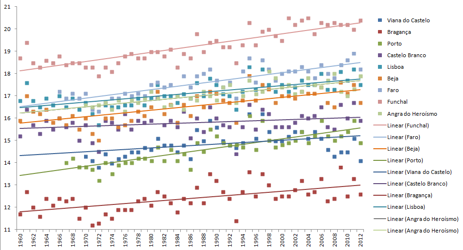 O INE (ou a Pordata) tem informação sobre isto. Por exemplo, as temperaturas dos últimos 50 anos estão aqui (o gráfico é meu, com os dados de http://www.pordata.pt/Portugal/Temperat ... al%29-1067):