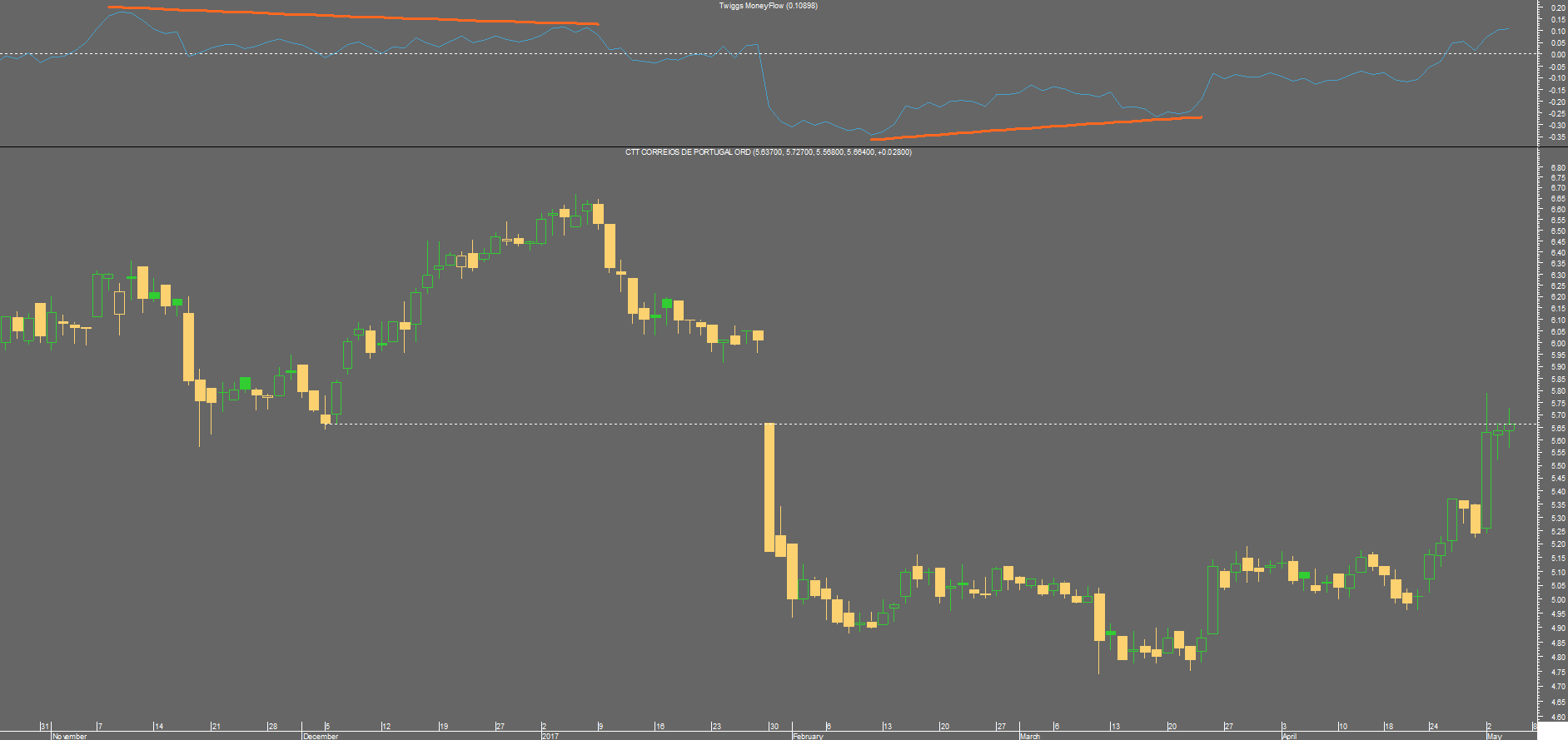 muito ao arrepio das minhas ideias, trago o gráfico dos ctt com um indicador de acumulação/distribuição, onde curiosamente se formam premonitoriamente duas divergências
