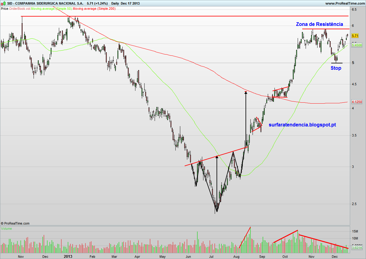 Se este meu palpite estiver correcto, o higher-low definido nos 5 dólares não será quebrado em baixa, pelo que passarei para lá o meu stop. Assistimos uma vez mais a uma animadora divergência de volumes, que cresceram durante todo o rally de alta e têm vindo a cair progressivamente desde o início da lateralização.