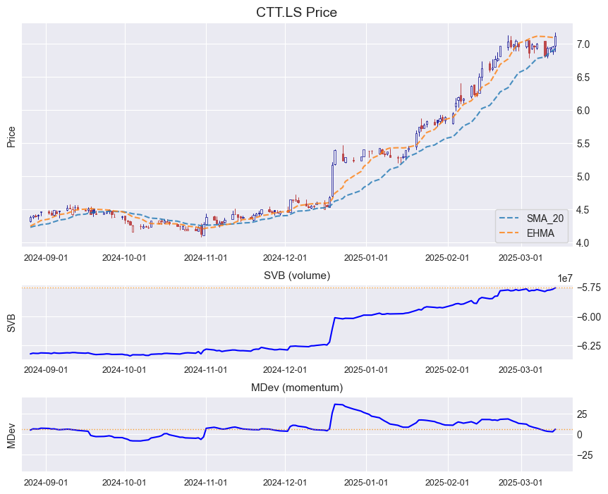 CTT com novos máximos relativos. O indicador de volume fez novos máximos (está em modo upa upa desde outubro). O momentum tem estado mais ou menos estável, em território positivo.