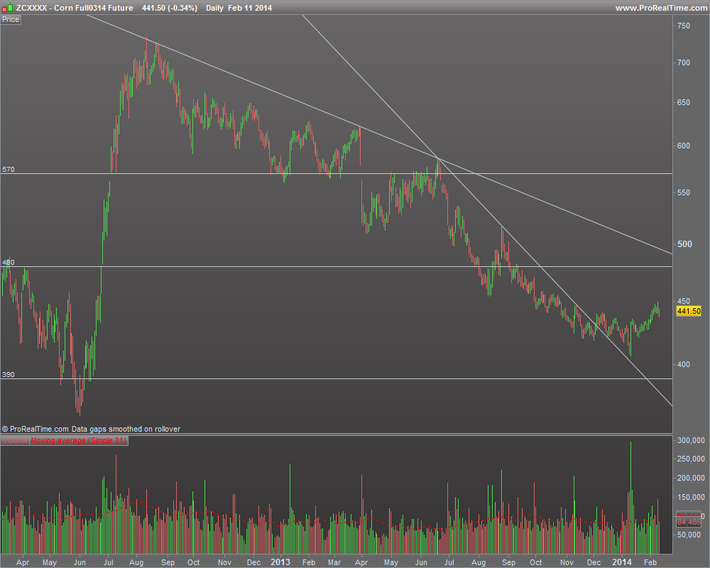 Aqui fica um gráfico de médio prazo (~2 anos). Subida fulminante de Jun a Ago de 2012 e alteração de tendência a partir daí com um S/R a ser estabelecido na zona dos 570 (toques em Jan e Fev/Mar de 2013 e depois quebra com retestes em Mai e Jun). Em Ago alguma indecisão à volta dos 480, que também vejo como S/R e a partir de Nov o "estancar" das quedas numa aparente lateralização. Em Jan deste ano tivemos um "velão" de 5% com volume elevado, com um movimento corretivo normal subsequente. A partir desta altura têm-se registado novos higher lows, estando a ser desenhado o que parece um round bottom. No curto prazo considero já a tendência ascendente. Acima dos 445 saímos da zona de lateralização/base do round bottom o que seria um sinal bastante bull. Em caso de entrada longa o meu stop iria para os 419 +coisa -coisa.
