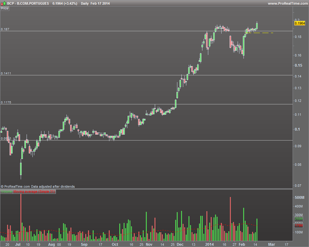 Por fim no BES, dado que está 40% acima do último suporte relevante e uma vez que não estou disposto a deixar essa valorização desaparecer mantendo o stop abaixo do suporte (1,07), caio na última situação, tendo que escolher um stop sem referências claras, mas onde o último swing altista está em vias de ser comprometido.
