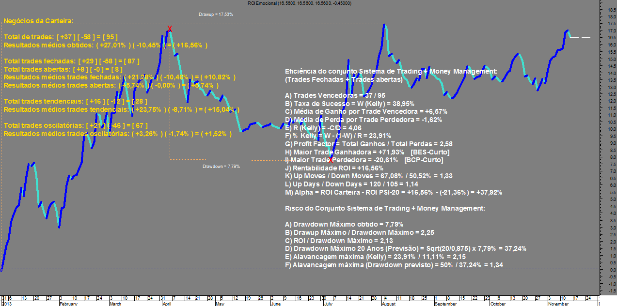 - Já no que respeita ao risco a assumir, atendendo ao conhecimento do máximo drawdown obtido até agora, do drawdown máximo esperado para os próximos 20 anos e daquele que estarei disposto a assumir no seu limite (50%, o equivalente a perder metade do capital da carteira algures ao longo de 20 anos da sua eventual existência) e ainda tendo em conta a performance do “Optimal f” do sistema de trading, conclui-se que a partir de 2015 os títulos da carteira poderão em média ser alavancados em termos de “money management” por um coeficiente que deverá estar compreendido entre os 1,34 aos 2,15 conforme podem observar abaixo nos cálculos da eficiência e risco do gráfico de resumo da curva de capital da carteira.