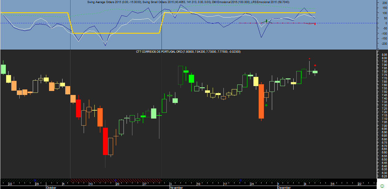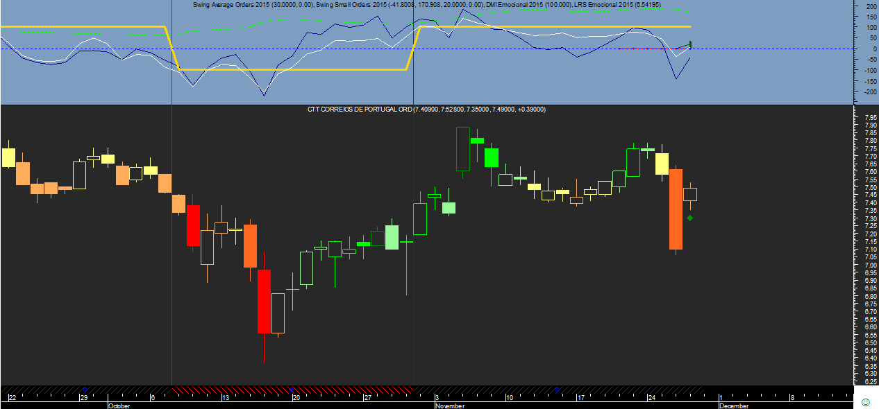 A sessão de hoje fica marcada por um sinal de compra em swing disparado nos CTT, seja através do oscilador de curto como o de médio prazo, ou seja, com uma quantidade significativa de 20% e 30% a acumular em relação ao montante do capital oscilatório dedicado a este título.