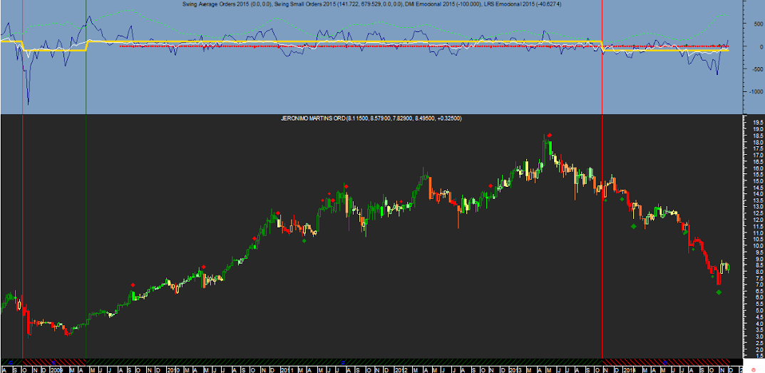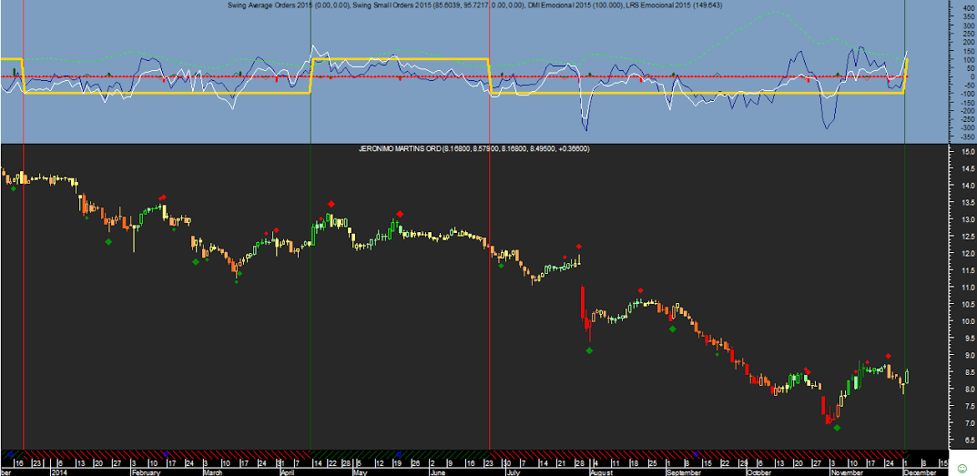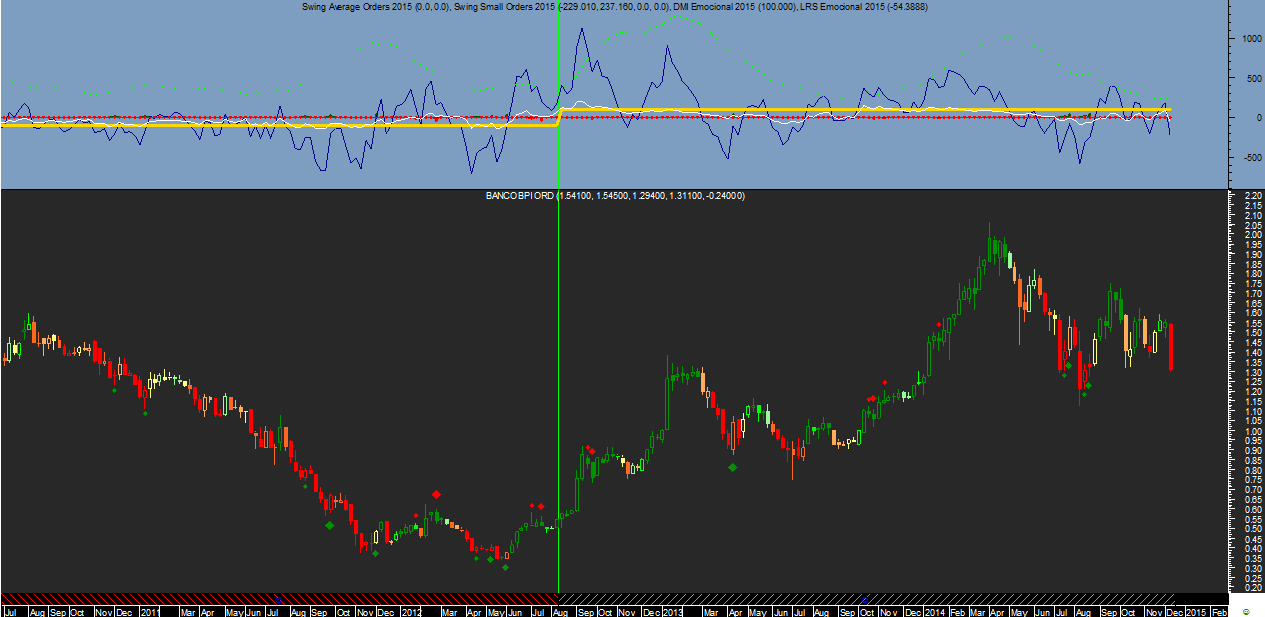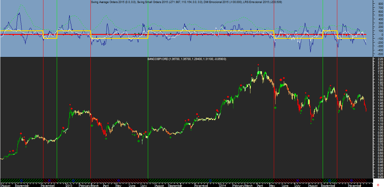 No caso do gráfico do BCP os indicadores de cima a verde e a vermelho representam os valores do otimismo e pessimismo diários no final de cada sessão, valores que são essenciais para calcular em seguida os indicadores de rating emocional de curto, médio e longo prazo que no fundo são aqueles que definem os sinais de entrada e saída em oscilações e tendências.