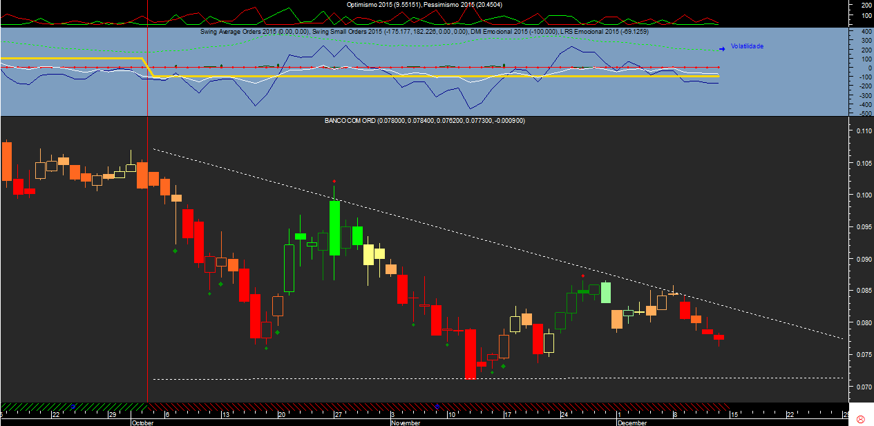 Já no gráfico dos indicadores do BCP, imediatamente abaixo dos referidos indicadores do otimismo e pessimismo, pode-se ver a fase desinteressante de lateralização a que está sujeito o BCP através da volatilidade que tem vindo a descer desde 21 de novembro até à presente data, precisamente 3 semanas de duração de um movimento de indecisão dentro de um triângulo descendente que deverá ser quebrado antes do “apex” (convergência final do triângulo) ser atingido no limite algures em meados do próximo mês de janeiro.