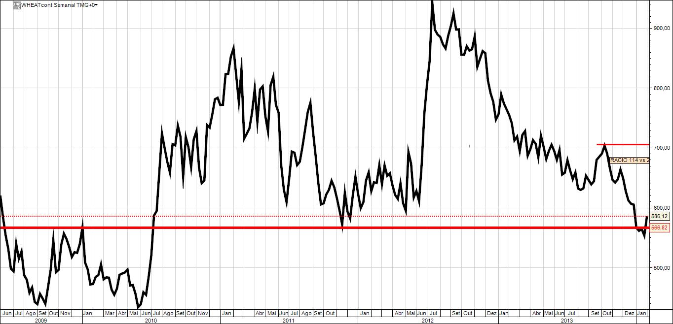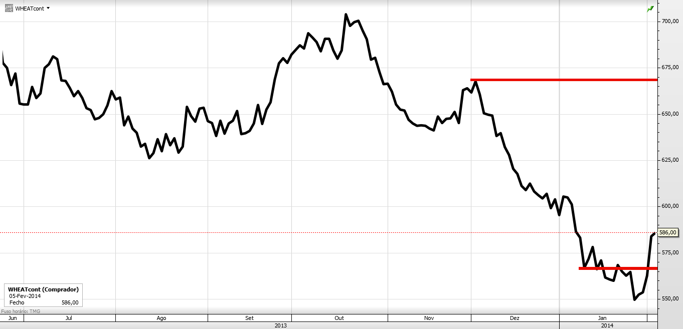 A minha visão de amigo de "agricultores", e que confirma esse gráfico, o trigo tinha vindo a ter preços muito baixos e no verão de 2012 o preço disparou, o que acontece é que no ano seguinte (2013) toda a gente foi produzir e o preço desceu...