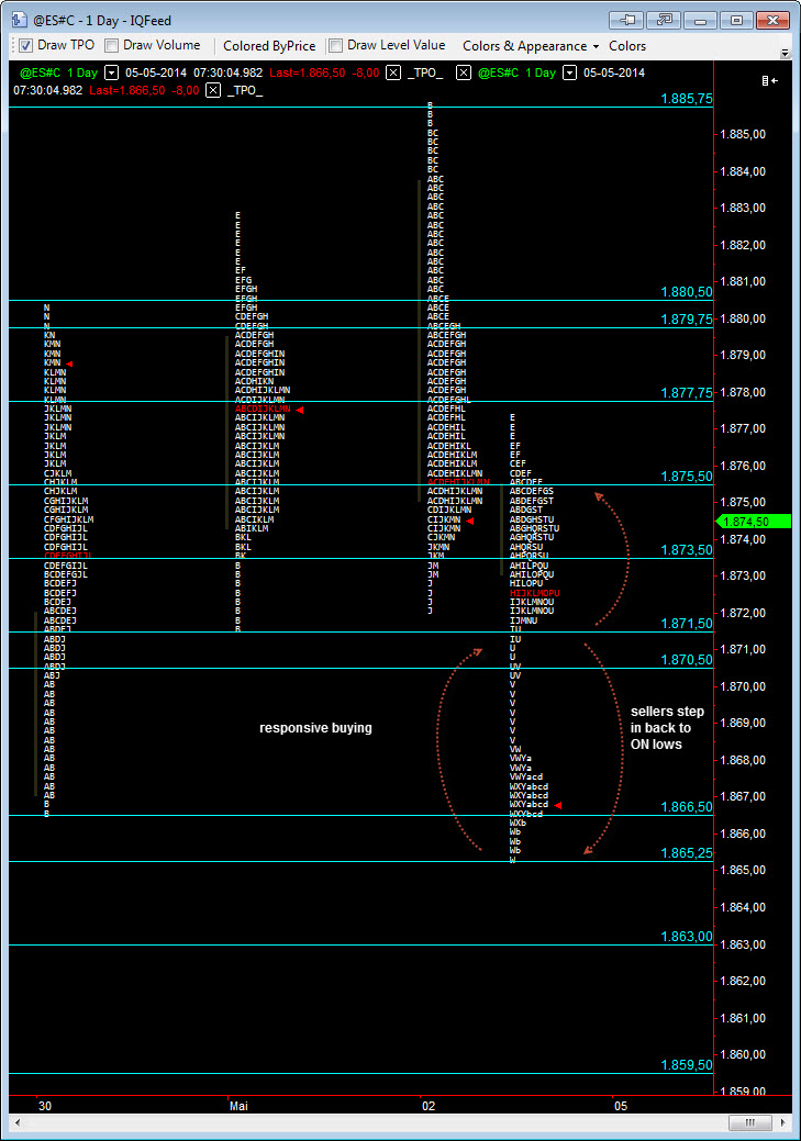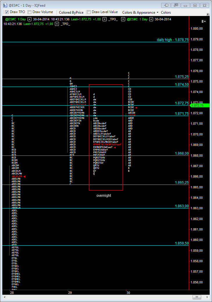 O grafico market profile mostra-nos a sessão overnight de hoje com uma dupla distribuição.