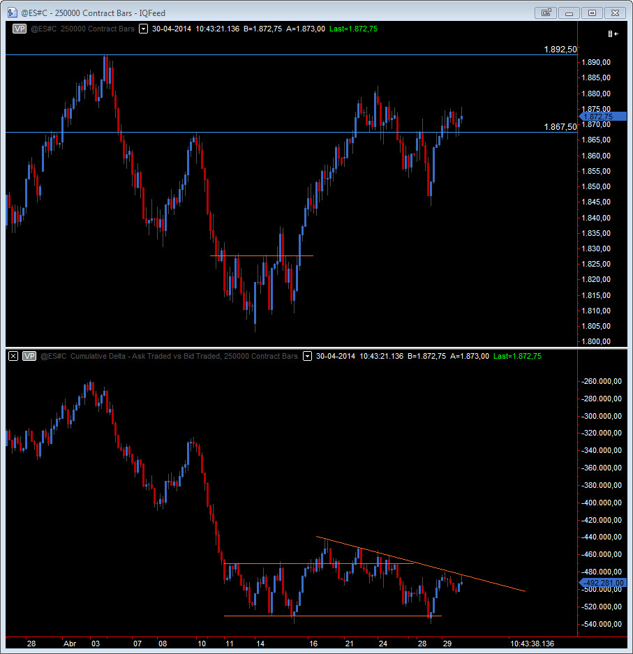 Se os preços conseguirem ir acima dos 82's será de extrema importancia seguir o delta pois caso exista uma reacção em alta, ou seja, indicando que os traders estão a negociar no offer, podemos ter um forte e rápido movimento de alta nos preços, indo facilmente para novos máximos com todo aquele inventário short a ser fechado. Os 1900 serão certamente o valor para onde os bulls mais olham neste momento.