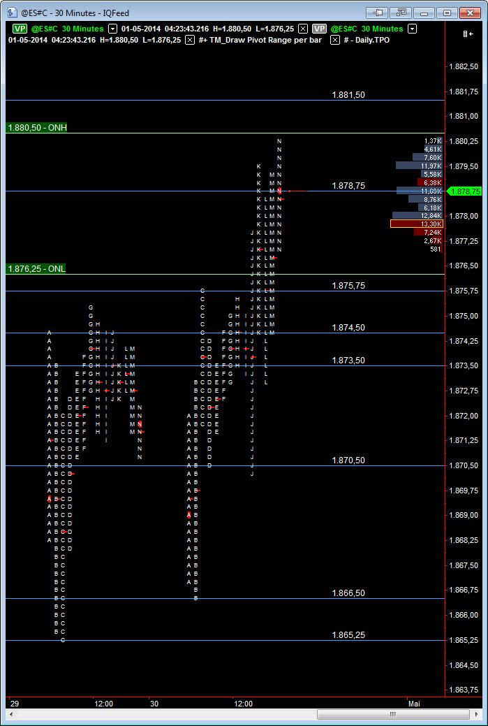 Podemos ver claramente as duas distribuições no volume, nos 1914's e nos 1900's onde existe um gap. Aliás, para a maioria dos traders a barra da 2ª feira passada não existe pois foi feriado e como tal o gap deveria ser o low de 3ª feira mas visto que 3ª e 4ª feira tiveram os seus lows logo acima da distribuição de 2ª feira, não me faz grande confusão em ter a barra no grafico.