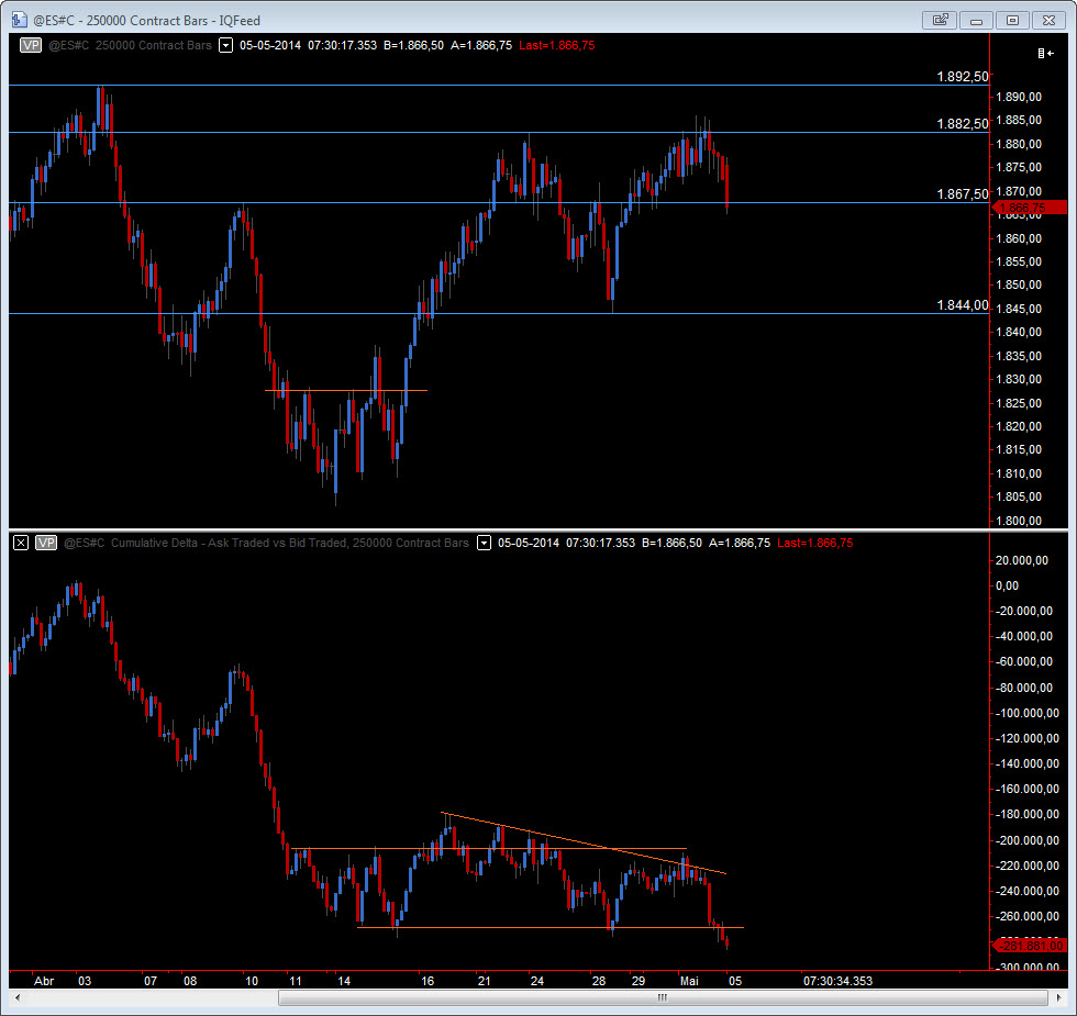 No entanto há que ter em atenção uma coisa, este ultimo sell off no ES trouxe o delta a testar aquele "suporte" deixando assim um padrão tipo duplo fundo.