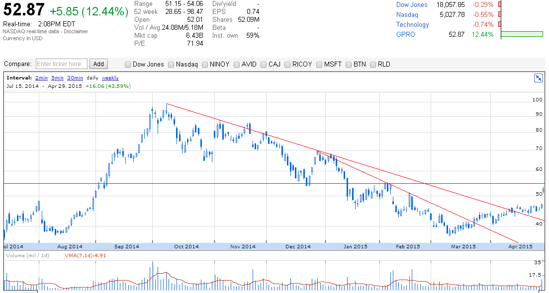 O gráfico da GPRO não está nada famoso e o Lusitaniatrader tem razão que há uma linha de suporte aos 64usd. É possível que muitos não entraram na GPRO porque ela esticou-se demasiado e quem entrou mais deve ter saído aos 95 usd. Os 64 usd podem ser um bom alvo, e com a diluição das novas ações possivelmente virá mais abaixo para encetar uma retoma dos preços. Estou fora por agora.