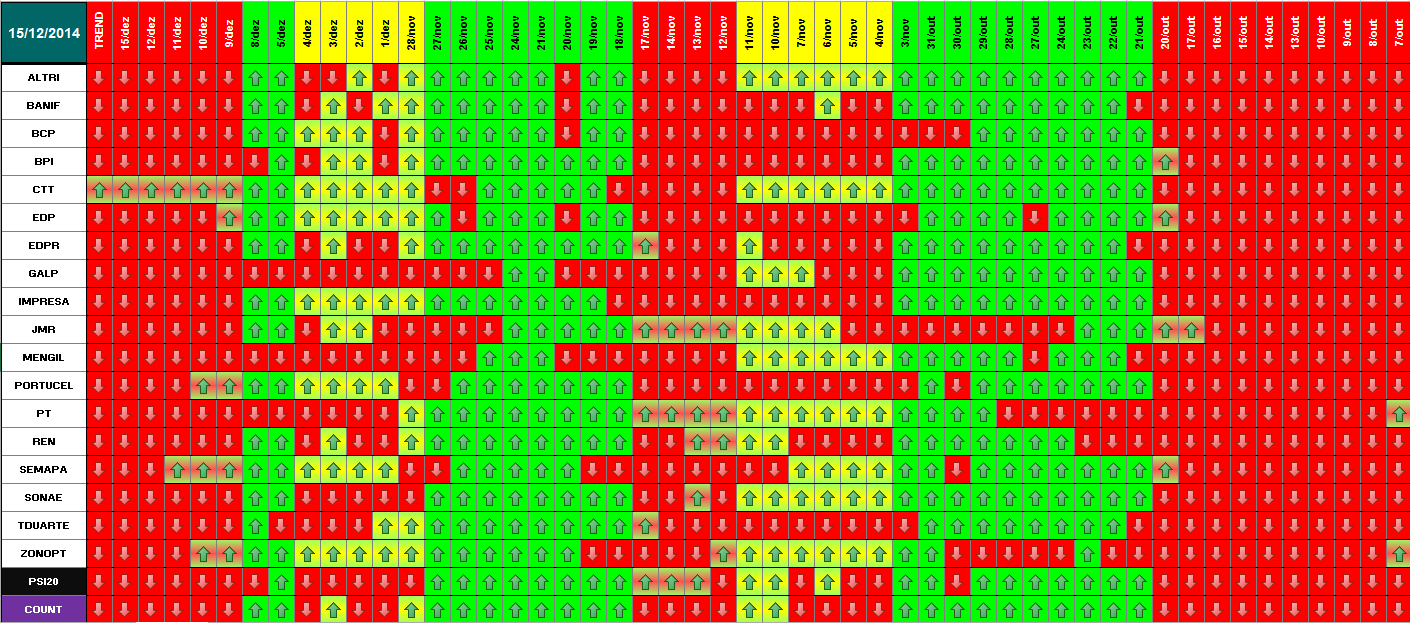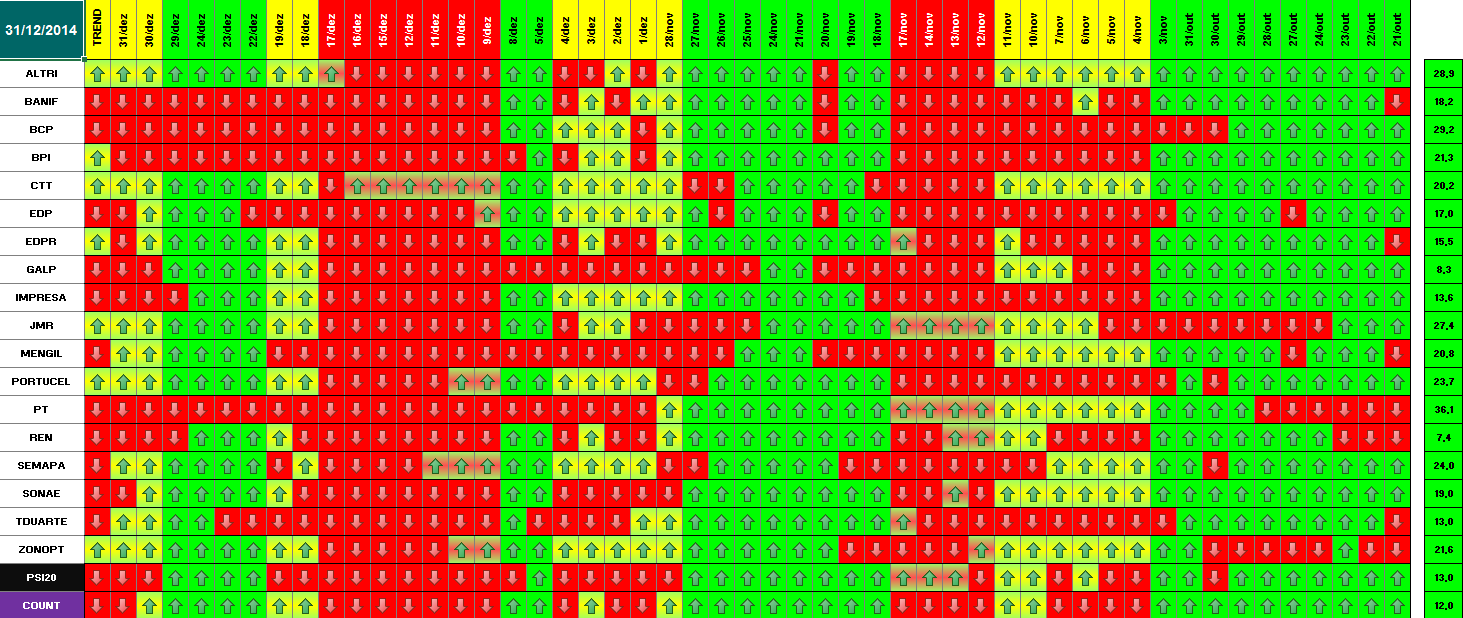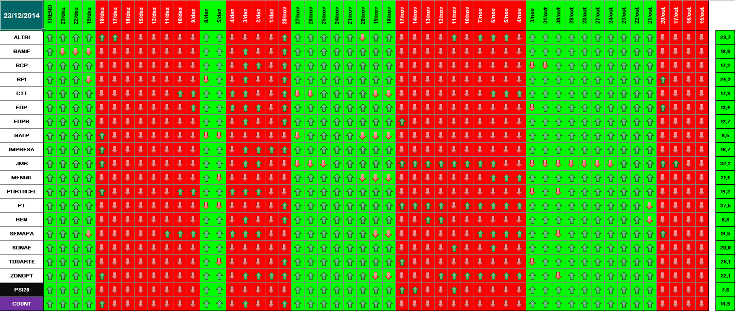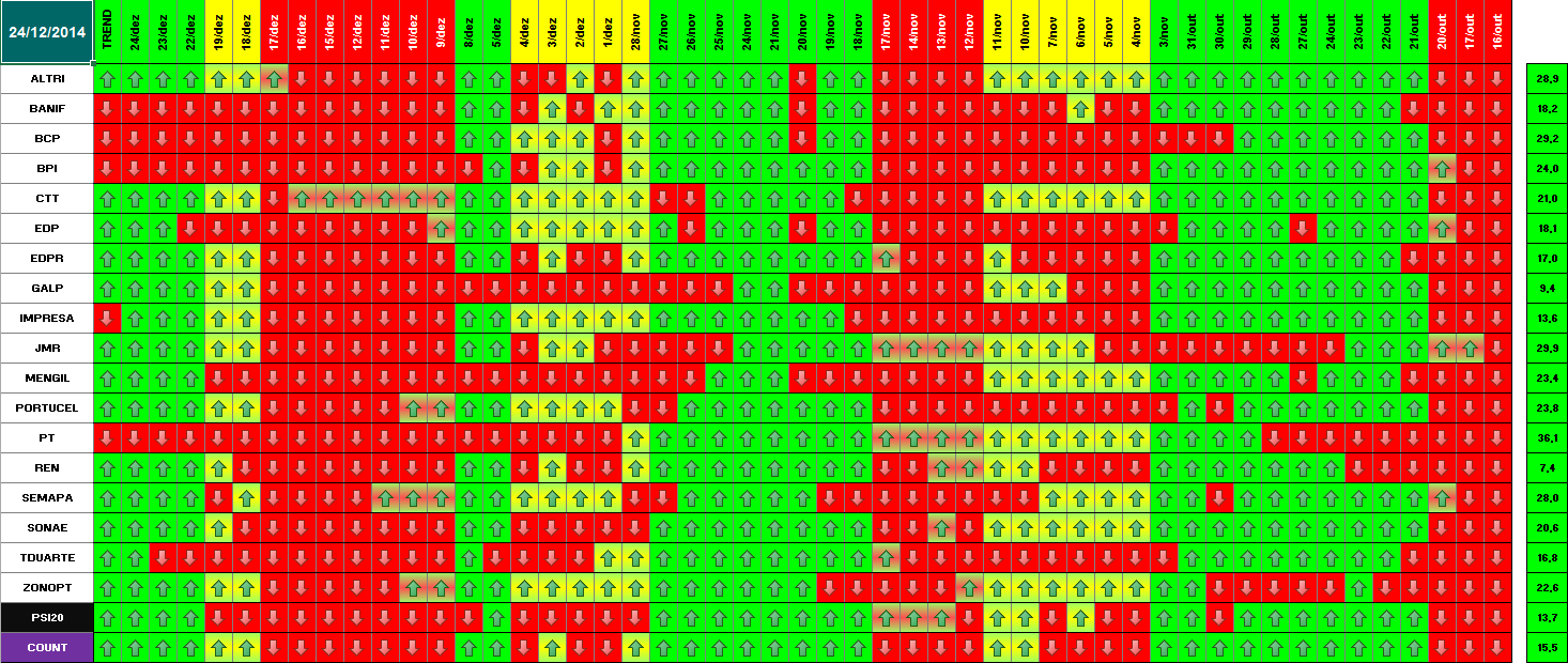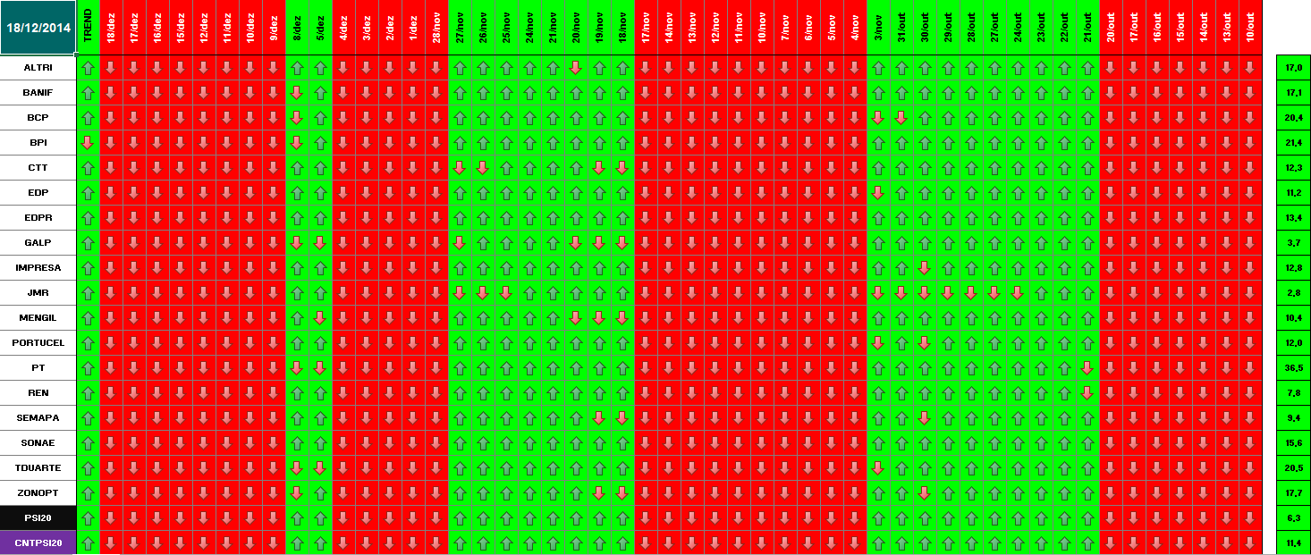 Segue em baixo informação / quadros atualizados com os dados de 18 de Dezembro de 2014. Se amanhã se confirmar este optimismo, o modelo deu sinal de presença no mercado. Hoje já se verificou essa informação para alguns títulos. Dos 18 títulos que compõem o PSI 20, metade (9) já deram sinal de entrada. Quanto ao optimismo de hoje e tendo em conta o sucedido a nível mundial (subida generalizada e com muita força em todas as praças), parece-me inquestionável que os investidores estão confiantes para os próximos dias. \:D/