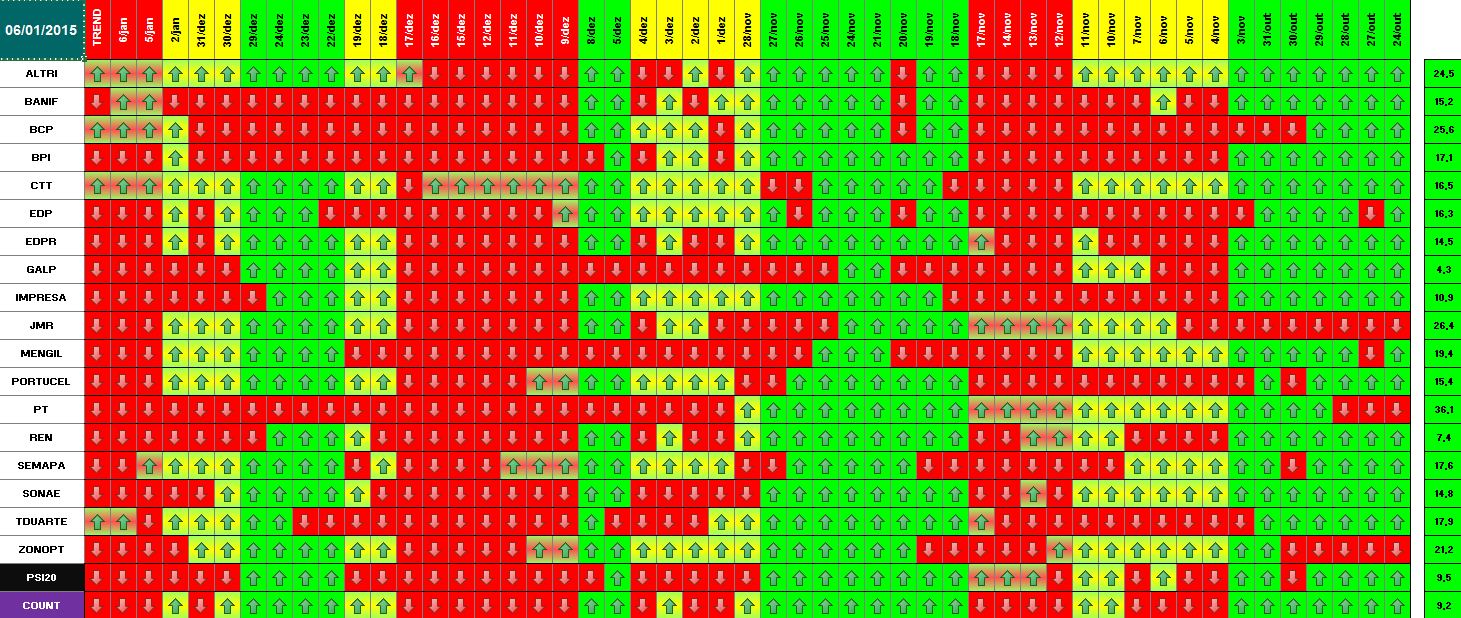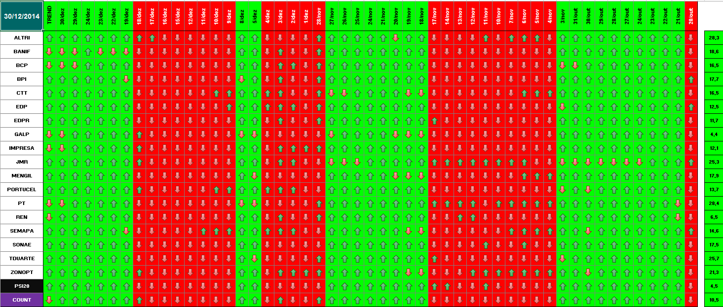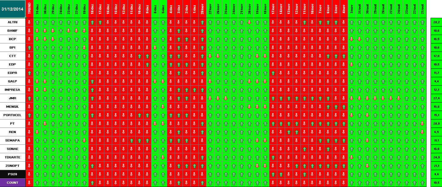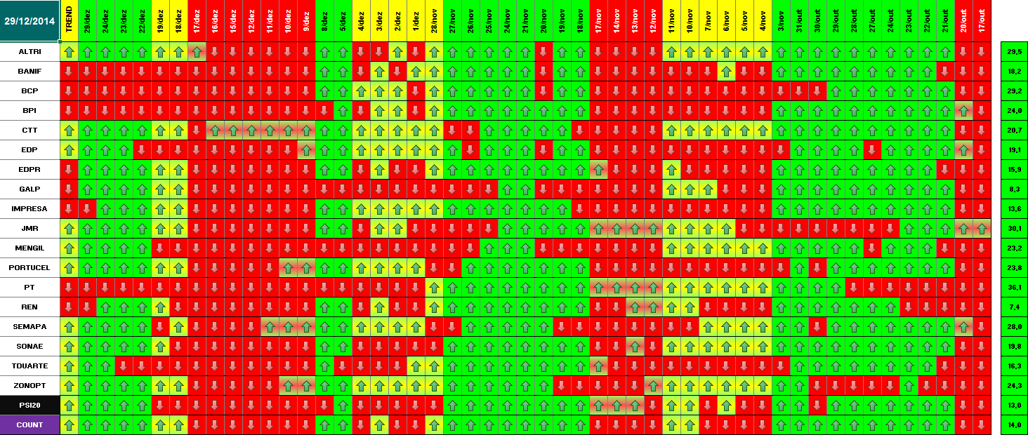 Segue em baixo informação / quadros atualizados com os dados de 18 de Dezembro de 2014. Se amanhã se confirmar este optimismo, o modelo deu sinal de presença no mercado. Hoje já se verificou essa informação para alguns títulos. Dos 18 títulos que compõem o PSI 20, metade (9) já deram sinal de entrada. Quanto ao optimismo de hoje e tendo em conta o sucedido a nível mundial (subida generalizada e com muita força em todas as praças), parece-me inquestionável que os investidores estão confiantes para os próximos dias. \:D/
