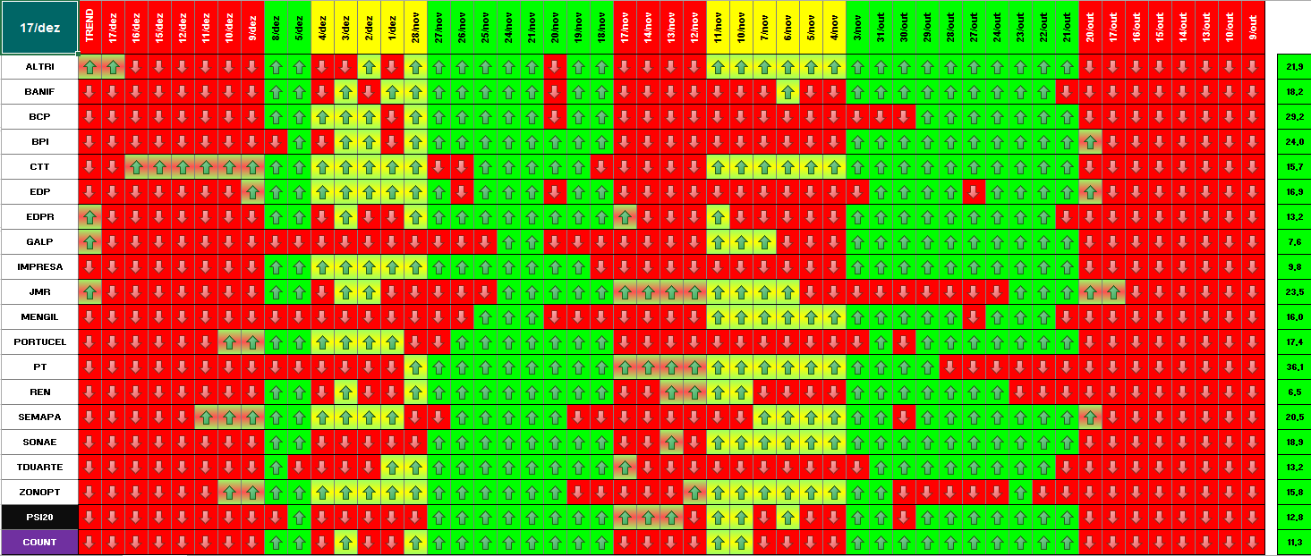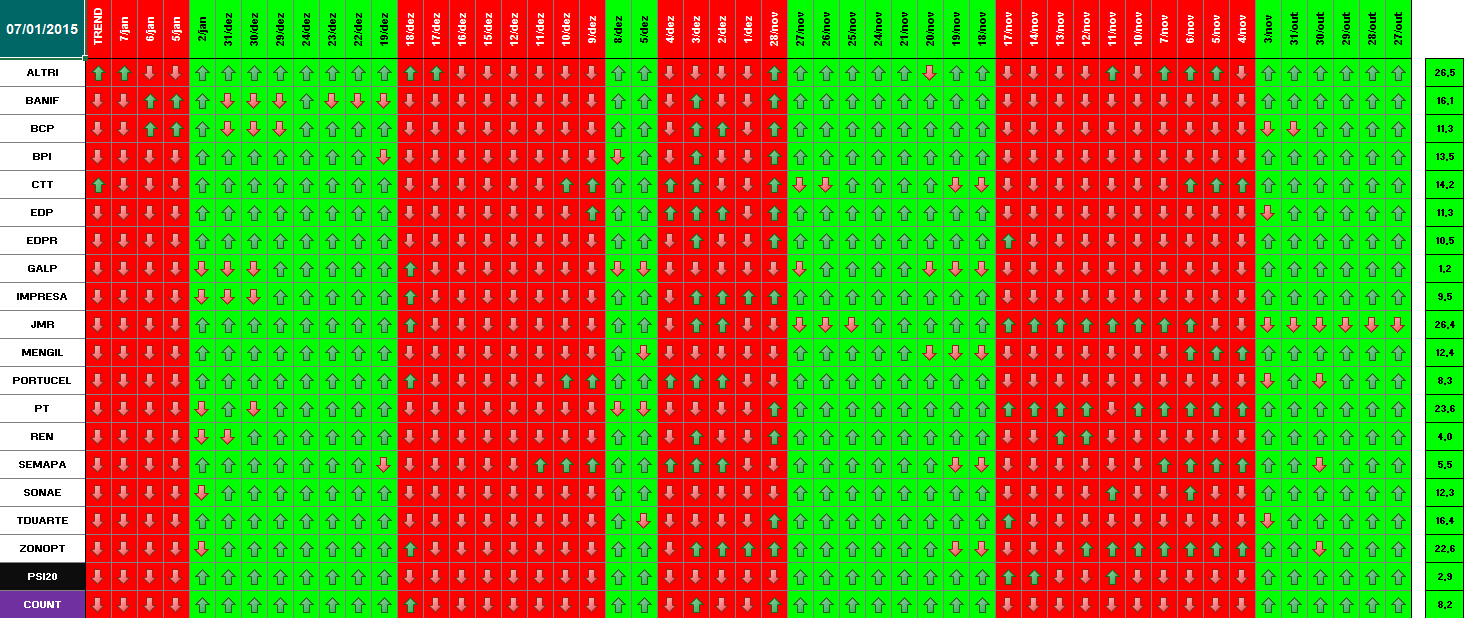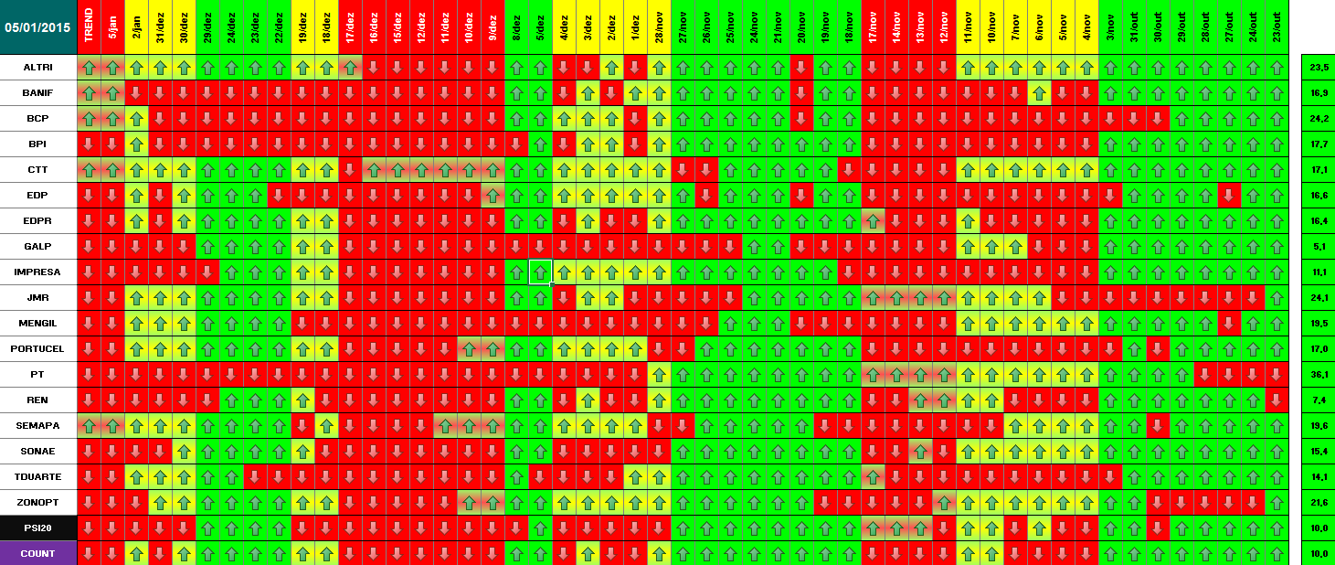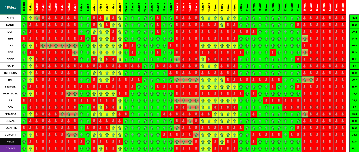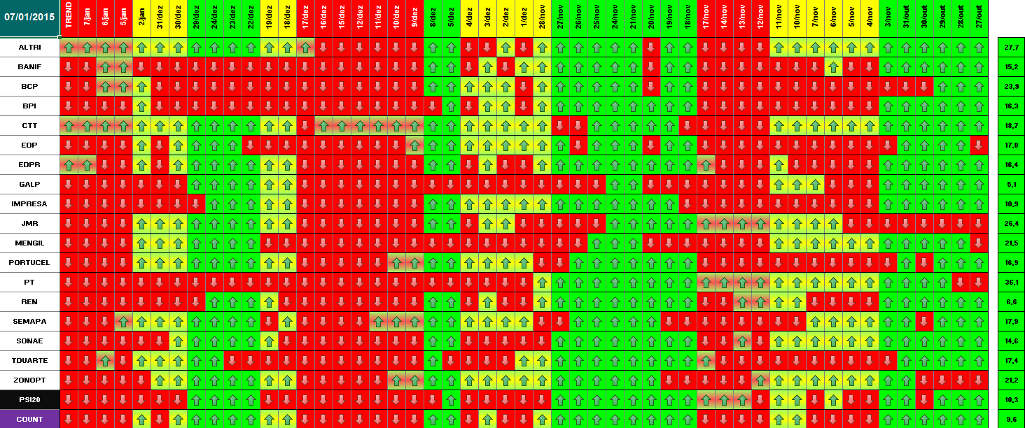 Segue em baixo informação / quadros atualizados com os dados de 18 de Dezembro de 2014. Se amanhã se confirmar este optimismo, o modelo deu sinal de presença no mercado. Hoje já se verificou essa informação para alguns títulos. Dos 18 títulos que compõem o PSI 20, metade (9) já deram sinal de entrada. Quanto ao optimismo de hoje e tendo em conta o sucedido a nível mundial (subida generalizada e com muita força em todas as praças), parece-me inquestionável que os investidores estão confiantes para os próximos dias. \:D/