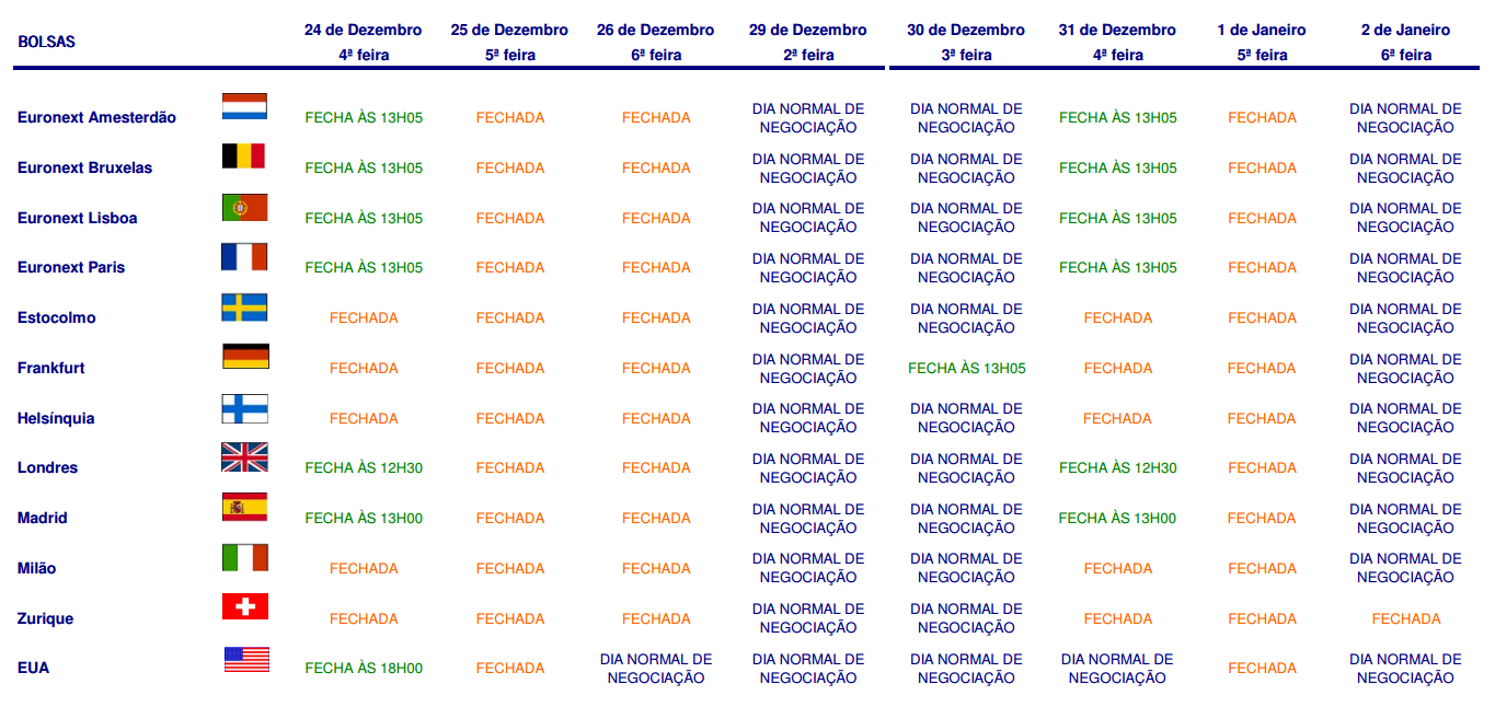 No que se refere à 2ª pergunta, durante a quadra natalícia, os horários de negociação das várias praças sofrem alterações. Segue em baixo quadro resumo por país (Fonte: BPI).