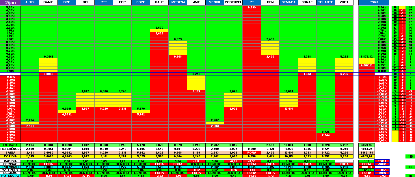 Tal como referido em intervenções / explicações anteriores apresento em baixo uma "análise de sensibilidade" do comportamento do índice / ação perante um intervalo de -5% a +5% para as ações e -2,5% a +2,5% para o índice, ou seja, trata-se uma simulação do comportamento da ação / índice para o dia seguinte.