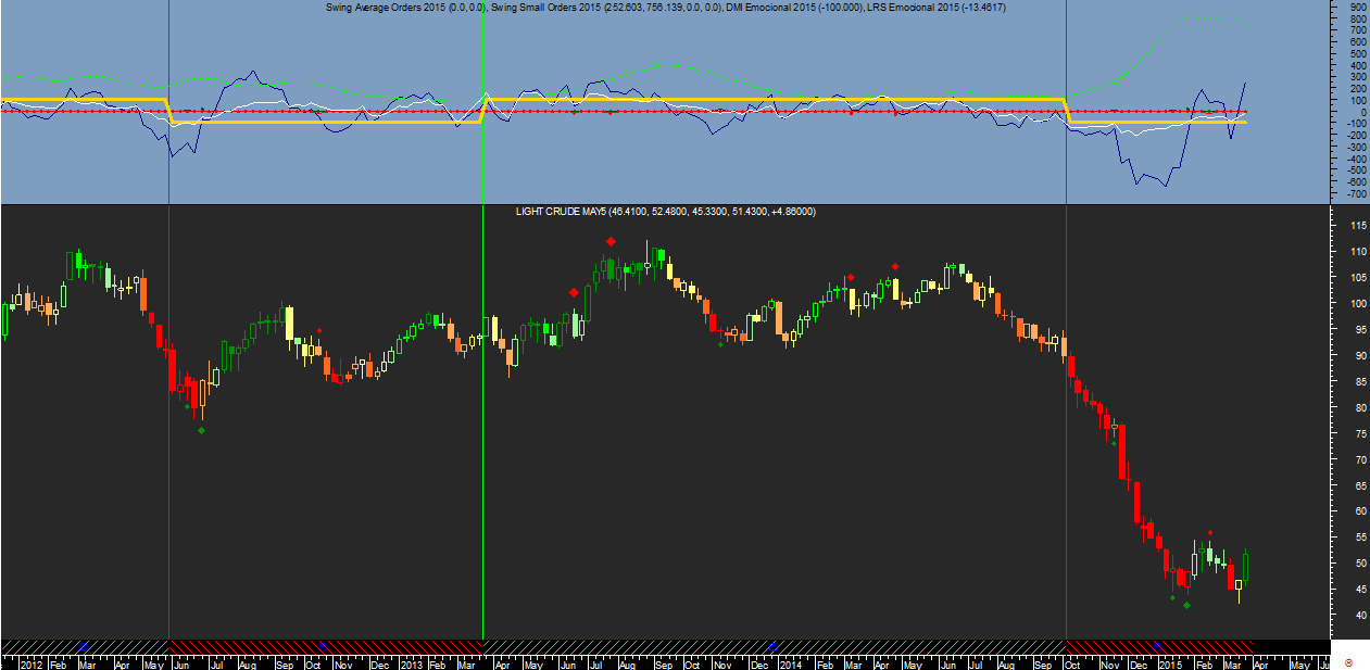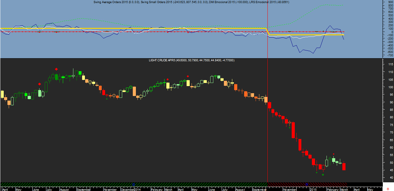 Se virmos a escala semanal o último sinal de venda tendencial foi disparado em 17 de Outubro de 2014 nos 85,20 $Usd/barril e na diária o sinal foi detetado um pouco mais cedo em 2 de Outubro de 2014 aos 90,74 $Usd/barril.