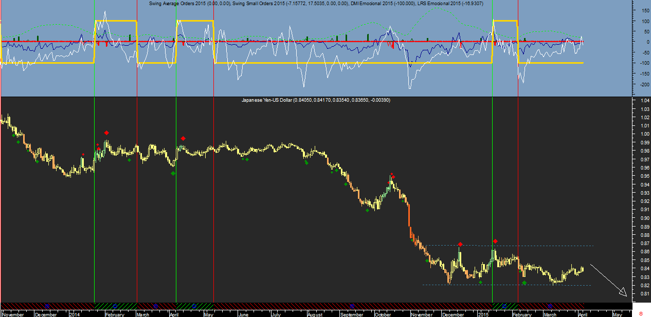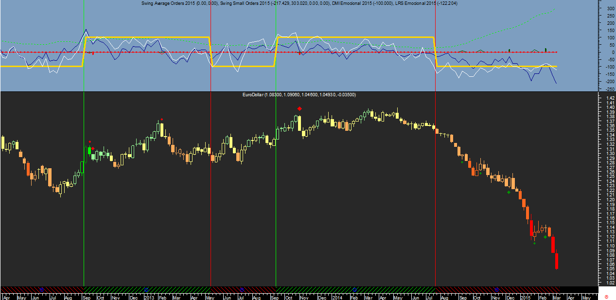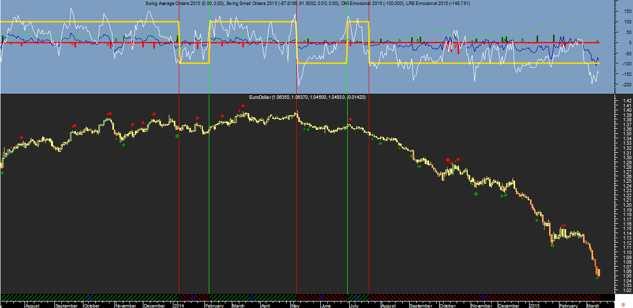 Desde a data de 3 de março até à última sessão do dia 13 do mesmo mês, através do indicador tendencial “Rating Emocional de longo prazo” de cor branca o qual pode ser visto no gráfico diário, que se acentua o sentimento de queda do Euro em relação ao Dollar.