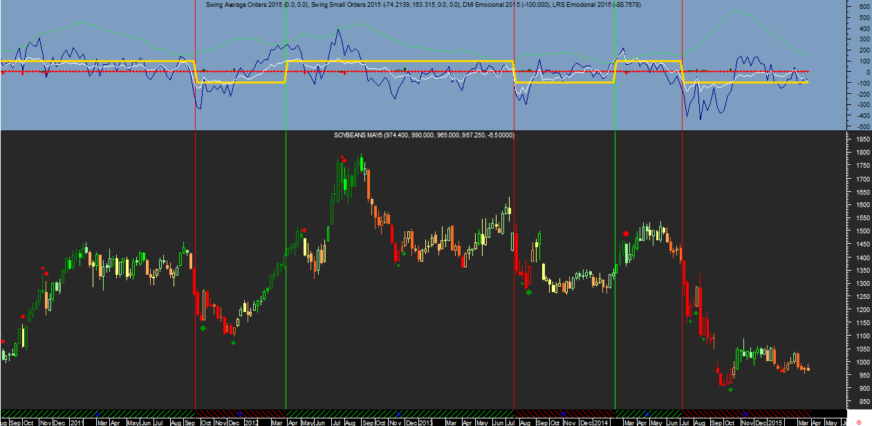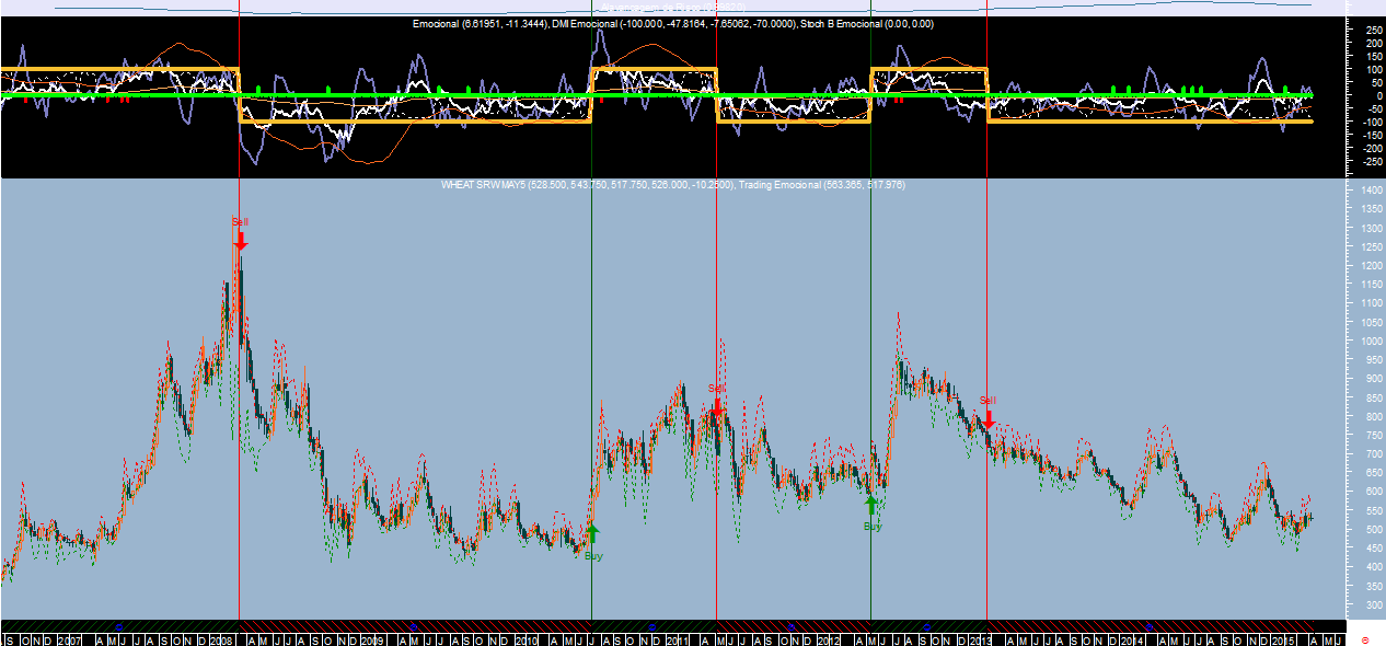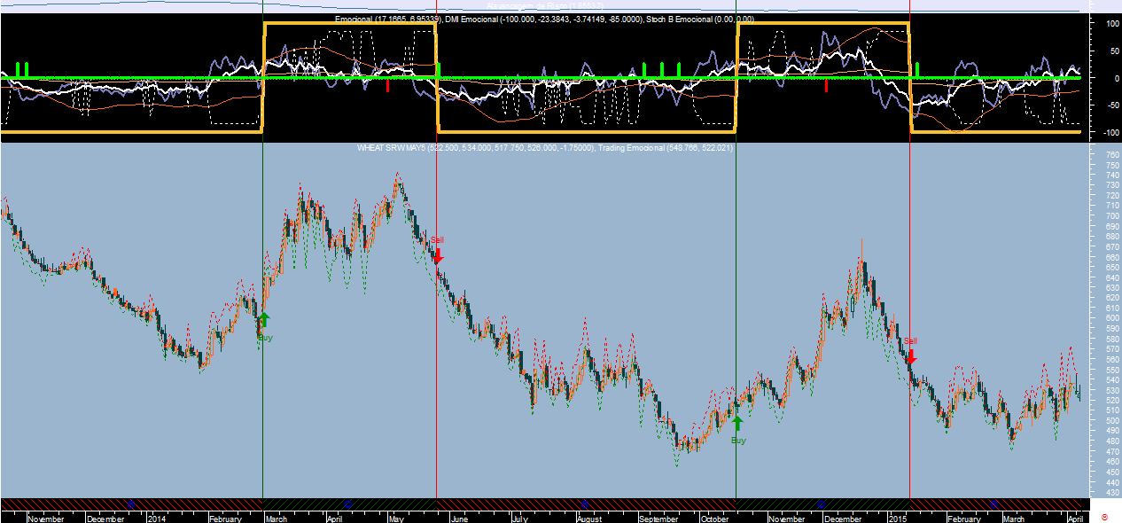 Este cereal tem uma particularidade na minha carteira pessoal, estou a usar dois sistemas de trading similares mas com algumas pequenas diferenças, o “Emocional 2014” e o “Emocional 2015”; acontece que o primeiro está com um sinal de venda no Trigo e o segundo aparece com um sinal neutro, neste último caso com uma compra na escala semanal e uma venda na diária.