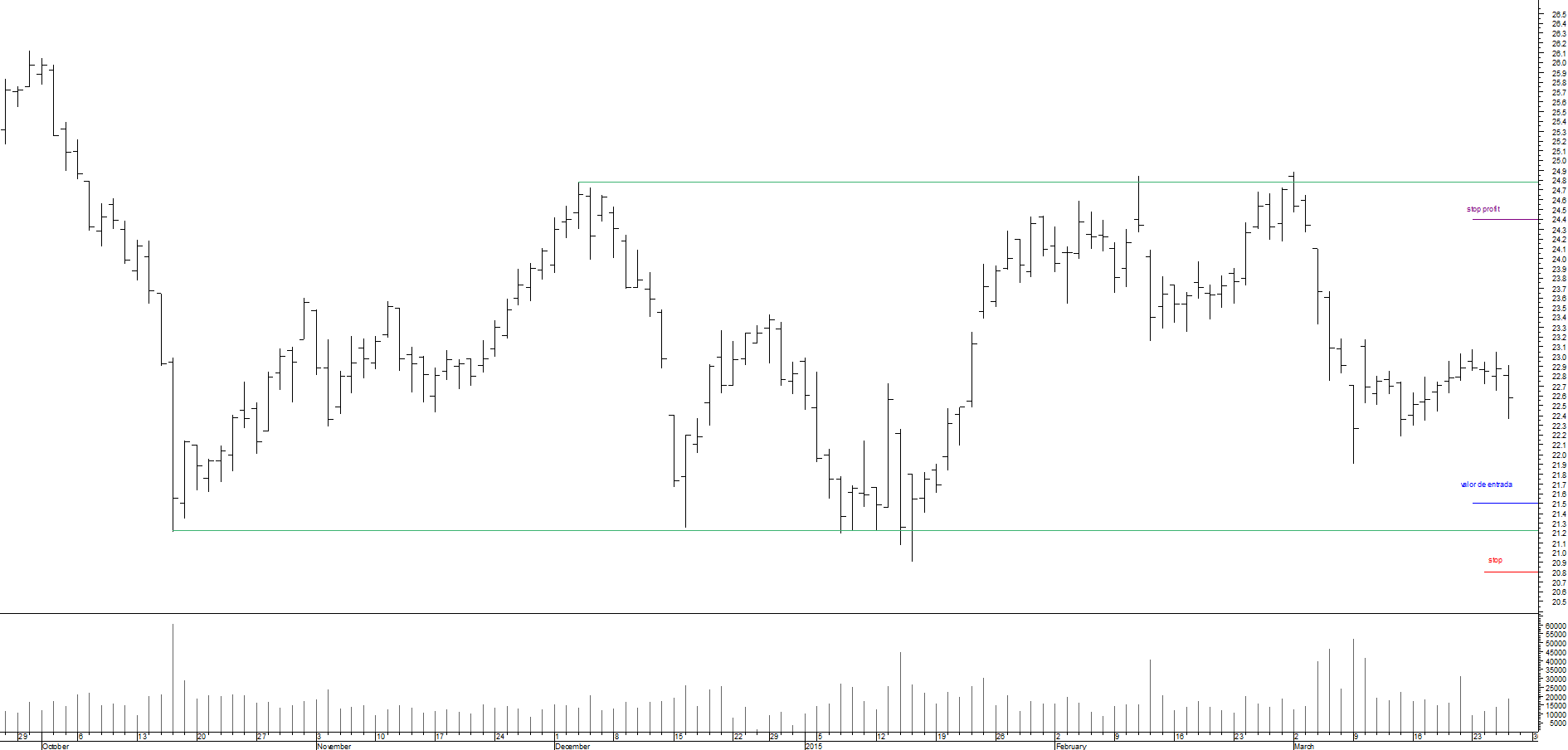 são os últimos topos e fundos da acção X; depois de se assegurar que não vai negociar uma triângulo descendente mas sim um rectângulo, há que ir ao gráfico, despi-lo de todo e qualquer ruído, eliminando linhas, indicadores, e então, só com o preço e o volume, traçar as linhas de suporte e resistência desta movimentação.