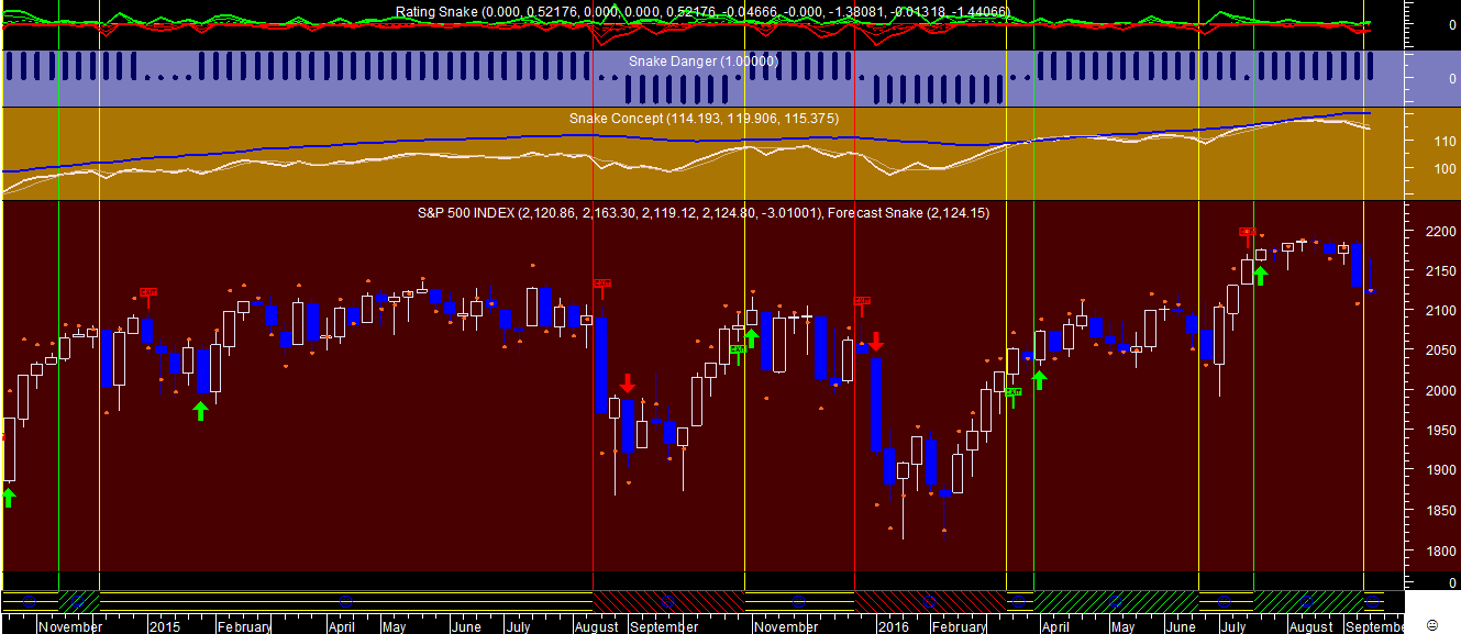 Embora o índice S&P 500 nao faça parte da carteira parece-me relevante assinalar que a “Cobra” a partir desta manha deixaria de estar comprada no índice, passando a neutral através dum sinal de venda no gráfico diário e de compra no semanal.