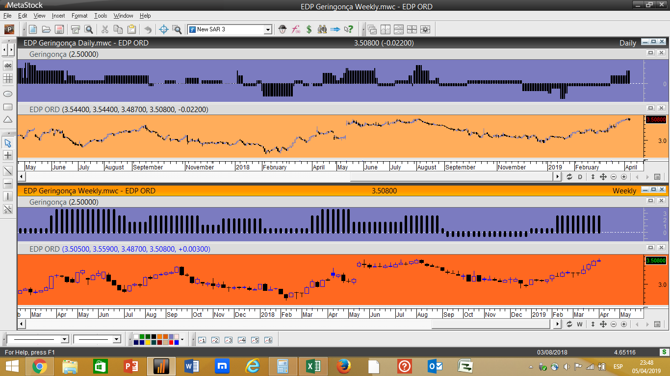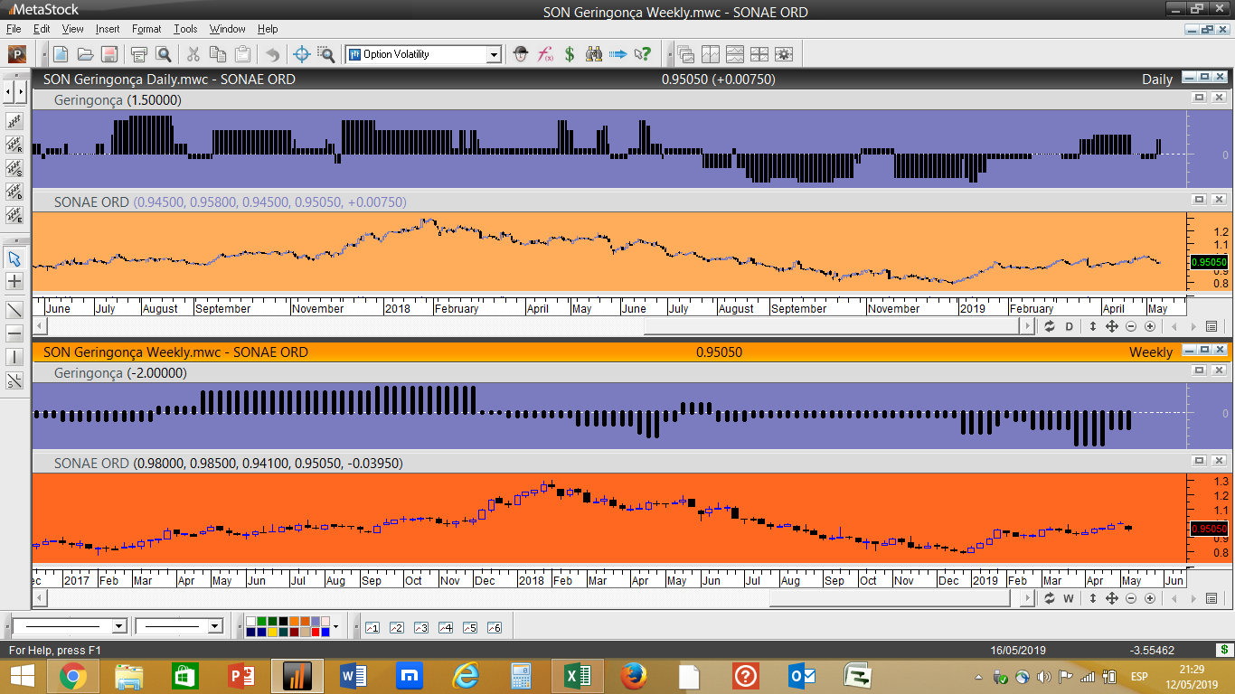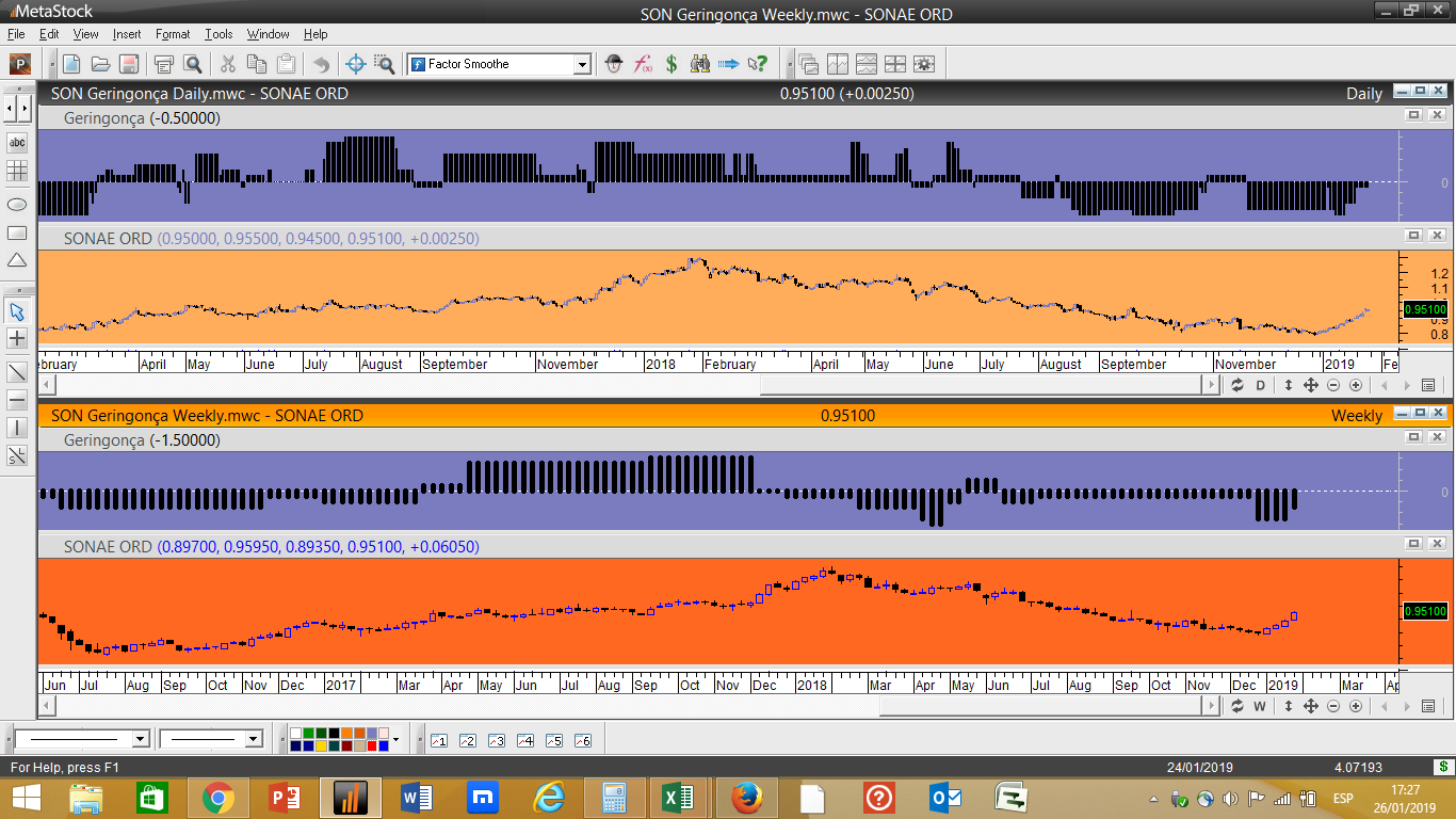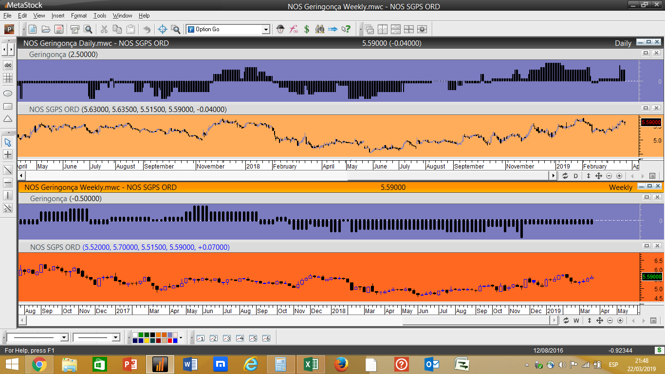 Em termos simplistas isto funciona com 5 indicadores tendenciais e 3 oscilatórios, quando um dos indicadores de oscilação acha que estamos perante um nível de resistência importante acrescenta um valor negativo ao ranking geral, desincentivando uma compra nestes níveis. Pelo contrário, se for localizada a cotação próxima dum determinado nível considerado como suporte significativo, independentemente do papel descer a sua cotação, nesse caso poderíamos ter um pequeno aumento do ranking e favorecer uma aproximação a possíveis compras.