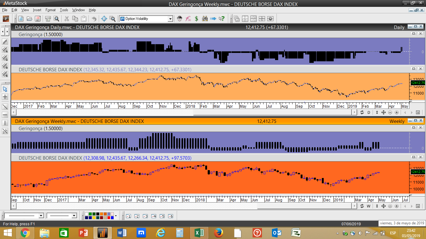 - No setor acionista o maior índice europeu, o DAX-30, acaba finalmente este ano de 2019 de disparar um sinal de compra, depois de várias semanas consecutivas ter estado na zona neutral da indecisao. Parece que o adágio popular dos mercados do "sell in may and go away" nao é para aqui chamado lá para os lados de Frankfurt, veremos...