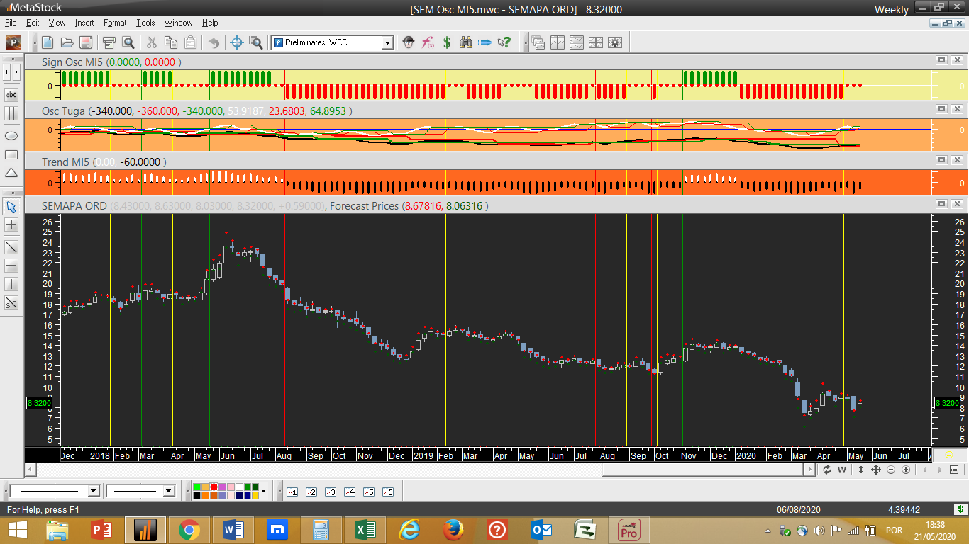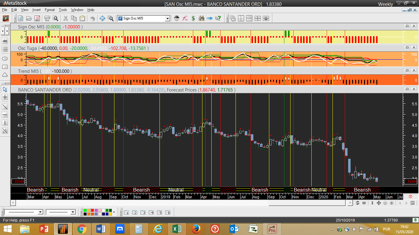 Santander. Um papel representativo da desgraça que tem vindo a ser o comportamento do sector bancário europeu, sem se vislumbrar para já qualquer perspectiva técnica de recuperação que permita confiar em pequenas aventuras para tentar pescar algo de jeito pelo lado das compras. Há que ter grande paciência e provavelmente aguardar por muitas semanas ou até, quem sabe, largos meses antes do seu aspecto poder apresentar boas perspectivas para arriscar posições no lado longo do mercado. No gráfico apresentado abaixo é muito evidente o seu nível de fraqueza, com o surgimento da sua última indicação positiva no ciclo de trading em novembro de 2019, ou seja, temos daí para cá mais de meio ano com os seus principais indicadores maioritariamente descendentes na escala semanal. Papel para esquecer no actual contexto do seu position trading... ou, há quem não goste desta abordagem, um bom veículo para ganhar uns cobres pelo lado curto do mercado!