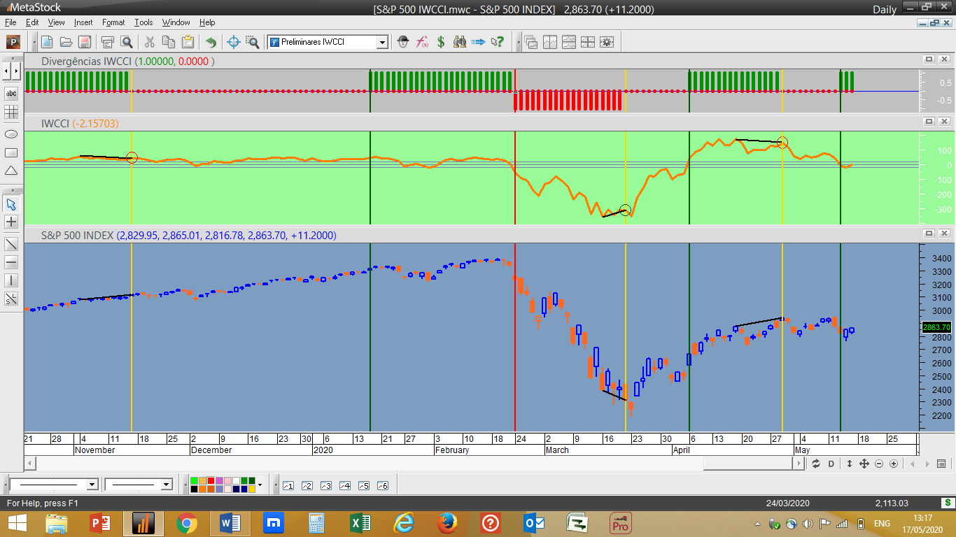 O resultado final dos sinais gerados por este indicador aparece no gráfico do S&P-500 aqui abaixo, como podem ver:
