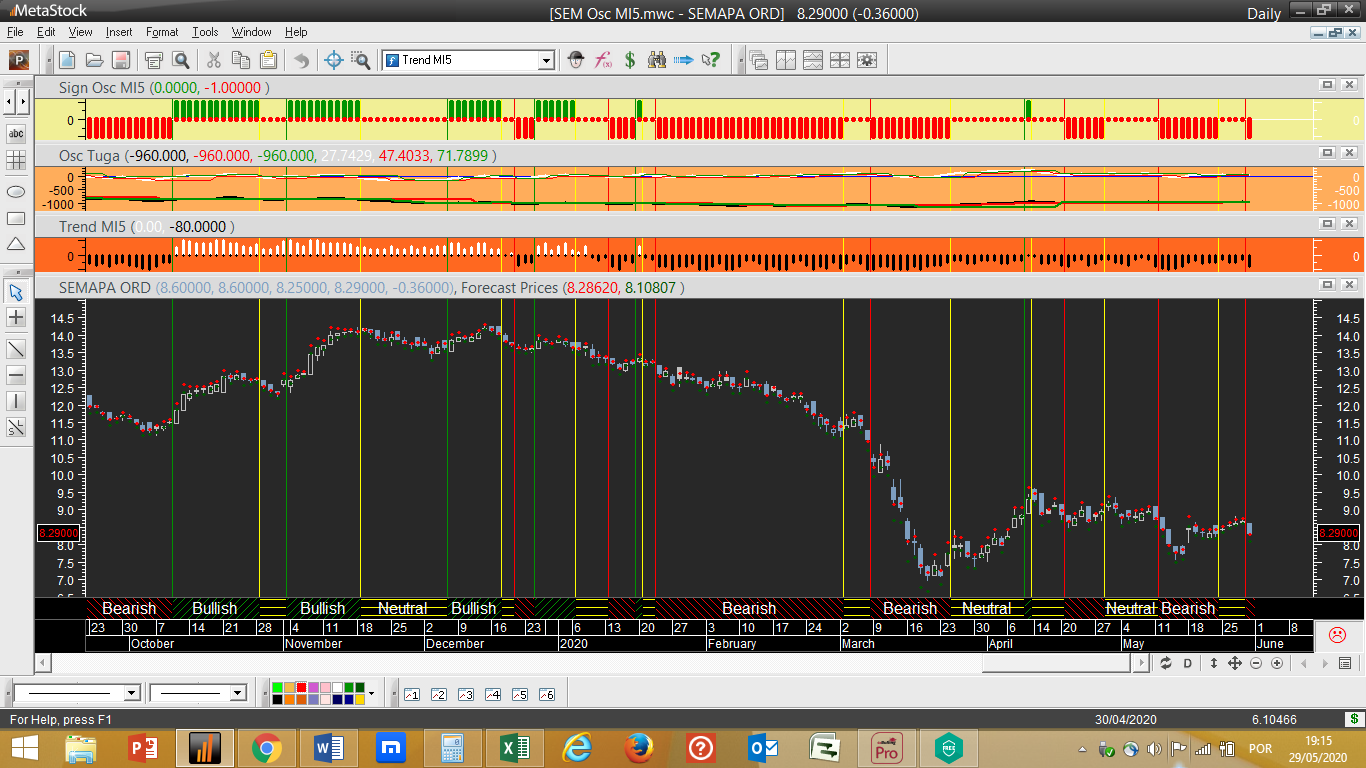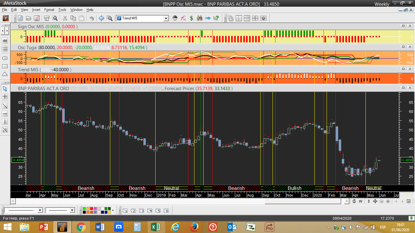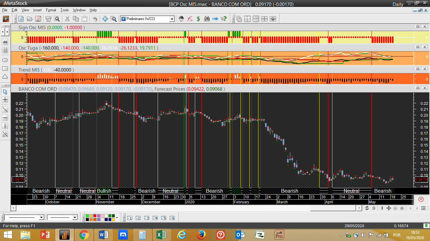 Para gráfico do dia escolhi um papel representativo do comportamento actual do sector bancário, o BNP Paribas, aliás um bom exemplo em que os indicadores do “Osc MI5” se adaptam bastante bem às alturas críticas das viragens de ciclo e tendência. Enquanto na escala diária o panorama parece ser risonho no presente, já na escala semanal, no gráfico apresentado, temos apenas como aspecto mais positivo a ocorrência do fim do ciclo de trading descendente ocorrida no dia 8 de maio. No entanto o indicador principal, representado pela tendência, continua negativo a marcar uma força de -40% e sem alterações nas últimas duas semanas. É certo que já esteve bem pior, desde inícios de março para cá, mas ainda tem de suar um pouco para atingir o limbo celestial positivo! Portanto o mais sensato é manter por enquanto o papel debaixo de olho mas com uma perspectiva neutral à data presente.