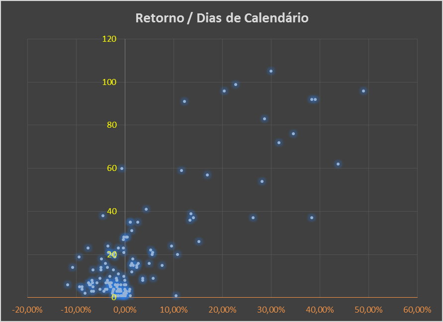 Por isso o primeiro gráfico abaixo representa, duma forma curiosa, uma foto sobre o comportamento do sistema de trading. Mostra o resultado líquido real do investimento de cada trade em função do número de dias de calendário de duração no negócio respectivo.
