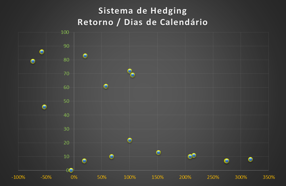 Por enquanto e por ser prematuro, devido ao número exíguo de dados na quantidade de trades de hedging, ao contrário do que foi dito acima para o sistema original “Osc MI5”, não é possível concluir que exista uma regressão linear válida no sistema de hedging com opções, relacionando os retornos por negócio com a sua duração.