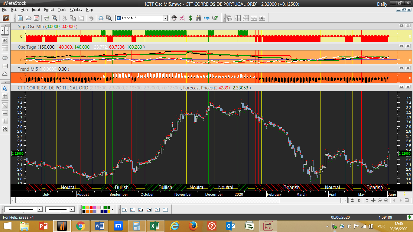 CTT – Passa de vendida a neutral. No gráfico abaixo pode ser vista a tendência diária a passar finalmente a positiva, o que já não acontecia desde janeiro do corrente ano, embora com um valor de força ainda reduzido de +10% a acompanhar o fim dum ciclo de trading negativo. Contudo o panorama semanal ainda mantém uma pendente descendente, pelo que para já a neutralidade é o melhor que se pode arranjar para o papel representativo dos nossos correios, na óptica do sistema de trading.
