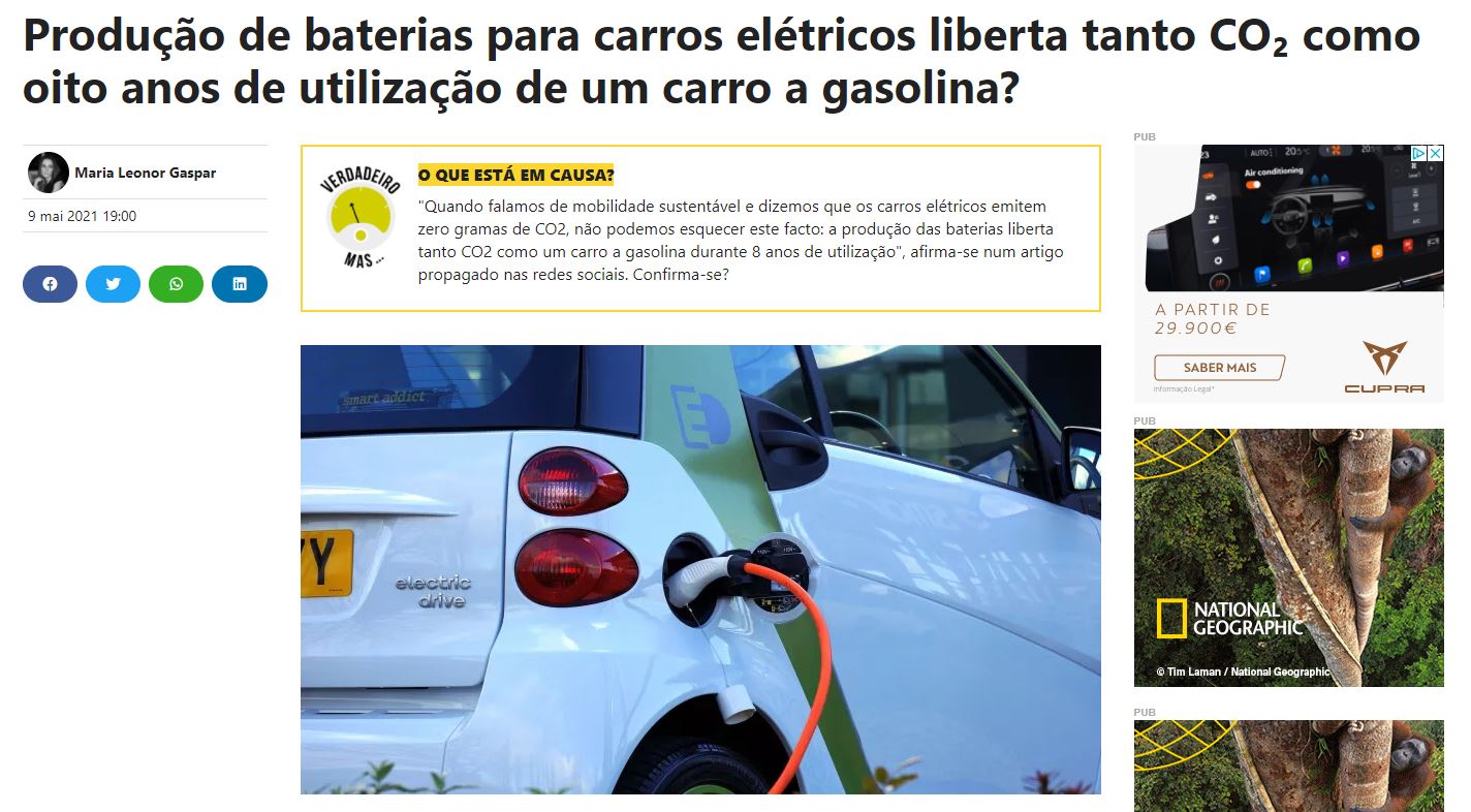 O texto indica que "o fabrico de baterias origina um elevado valor de emissões" e que "cada kWh de capacidade da bateria gera entre 150 a 200 quilogramas de CO2" apenas na fábrica. "Quer isto dizer que uma bateria de 30 kWh emite, na produção, 4500 quilos de CO2. Mas se estivermos a falar de uma bateria de 100 kWh esse valor é quase ofensivo: 15 toneladas de CO2", acrescenta o texto.