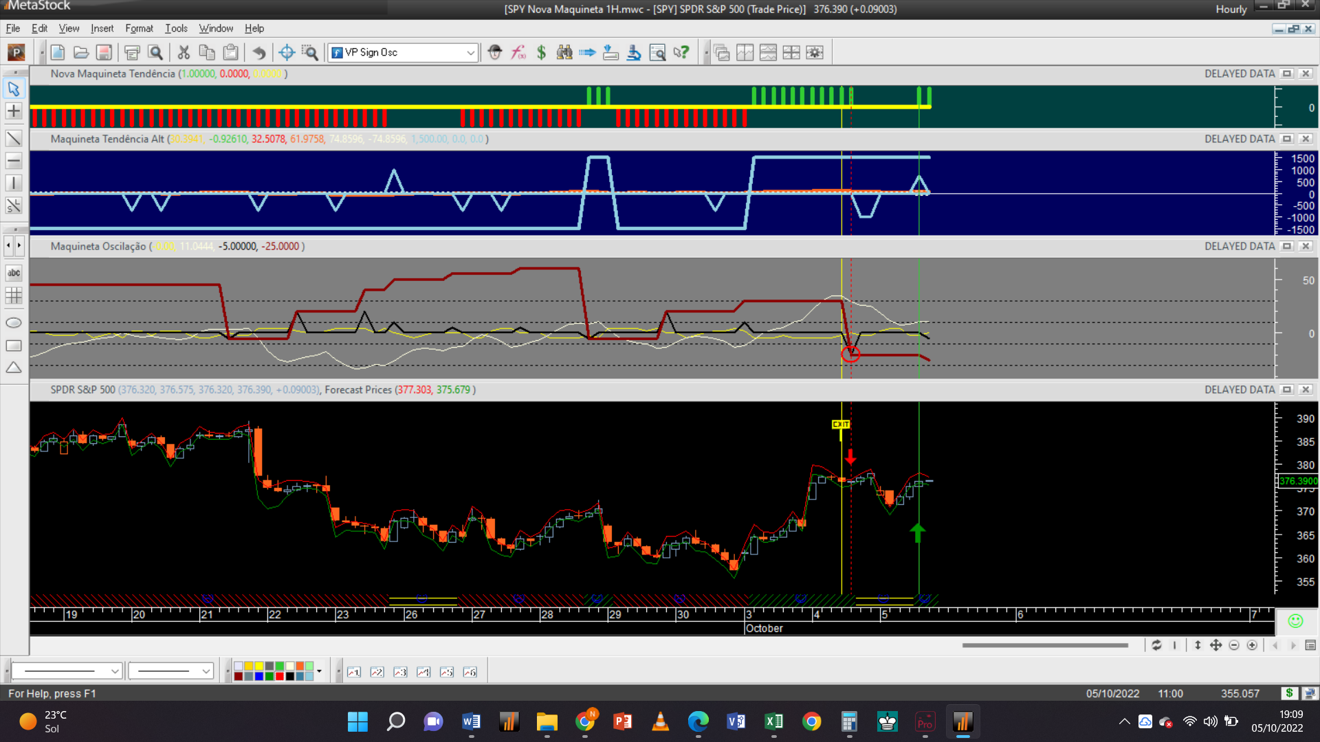 Mesmo a terminar a sessão o sistema de trading acaba de dar um sinal de venda na tendência do gráfico horário, revertendo o seu sentido positivo para negativo.