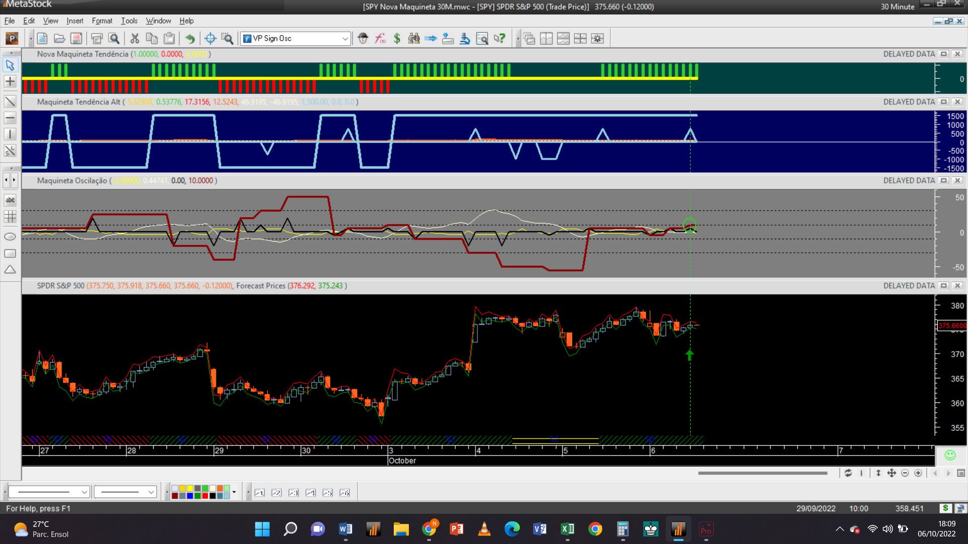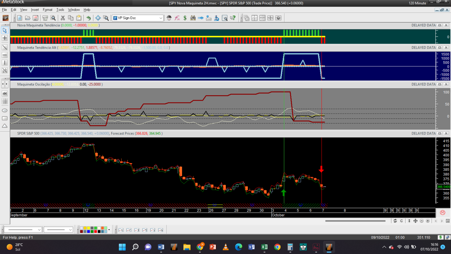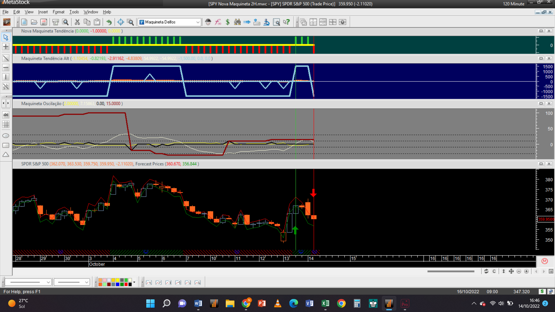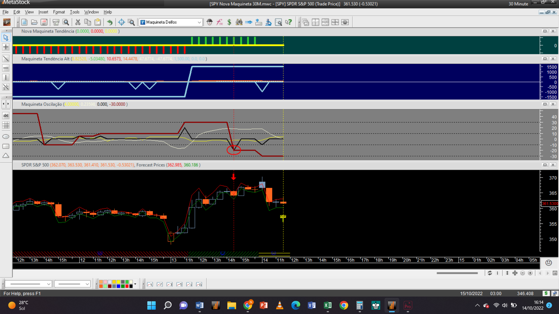 Antes de fornecer aqui a próxima trade permitam-me efetuar um aviso: troquei o gráfico dos 2 dias pelo de 15 minutos, que à semelhança da escala de meia hora só possui autorização para trades do tipo oscilatório, porque detetei que o gráfico 2D padece dum problema dum “bug” curioso de origem, que acabei de detetar e que terei de relatar ao suporte de clientes da plataforma do Metastock.