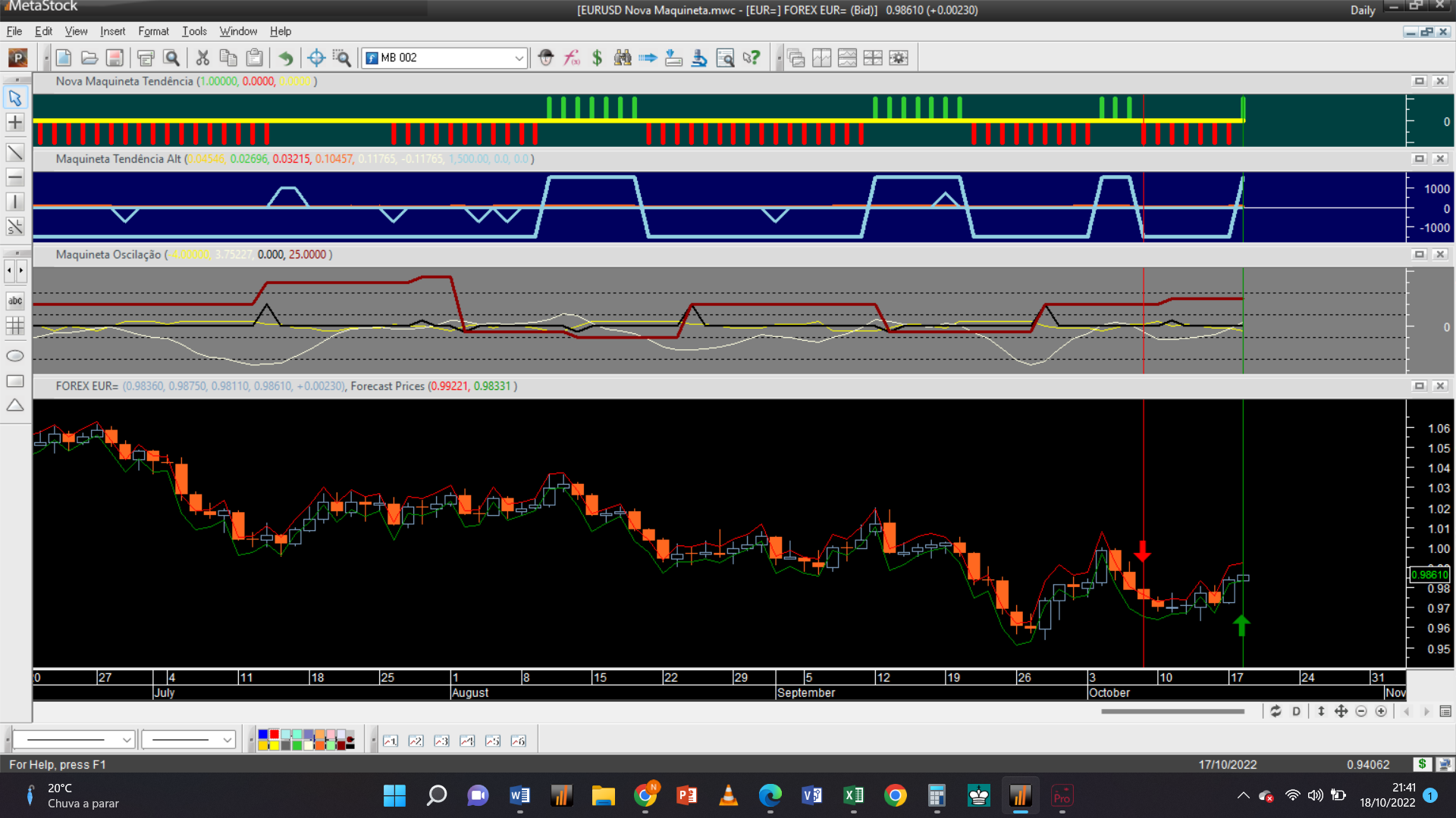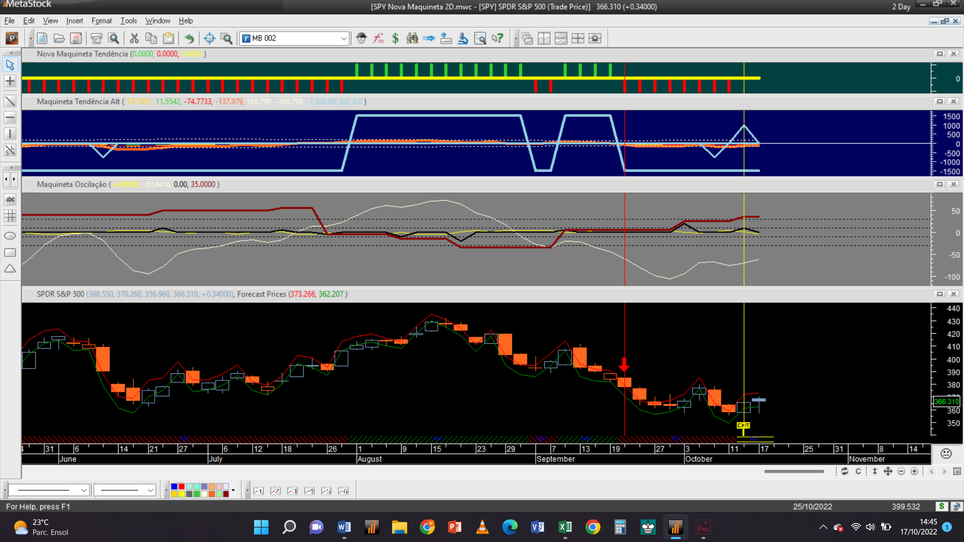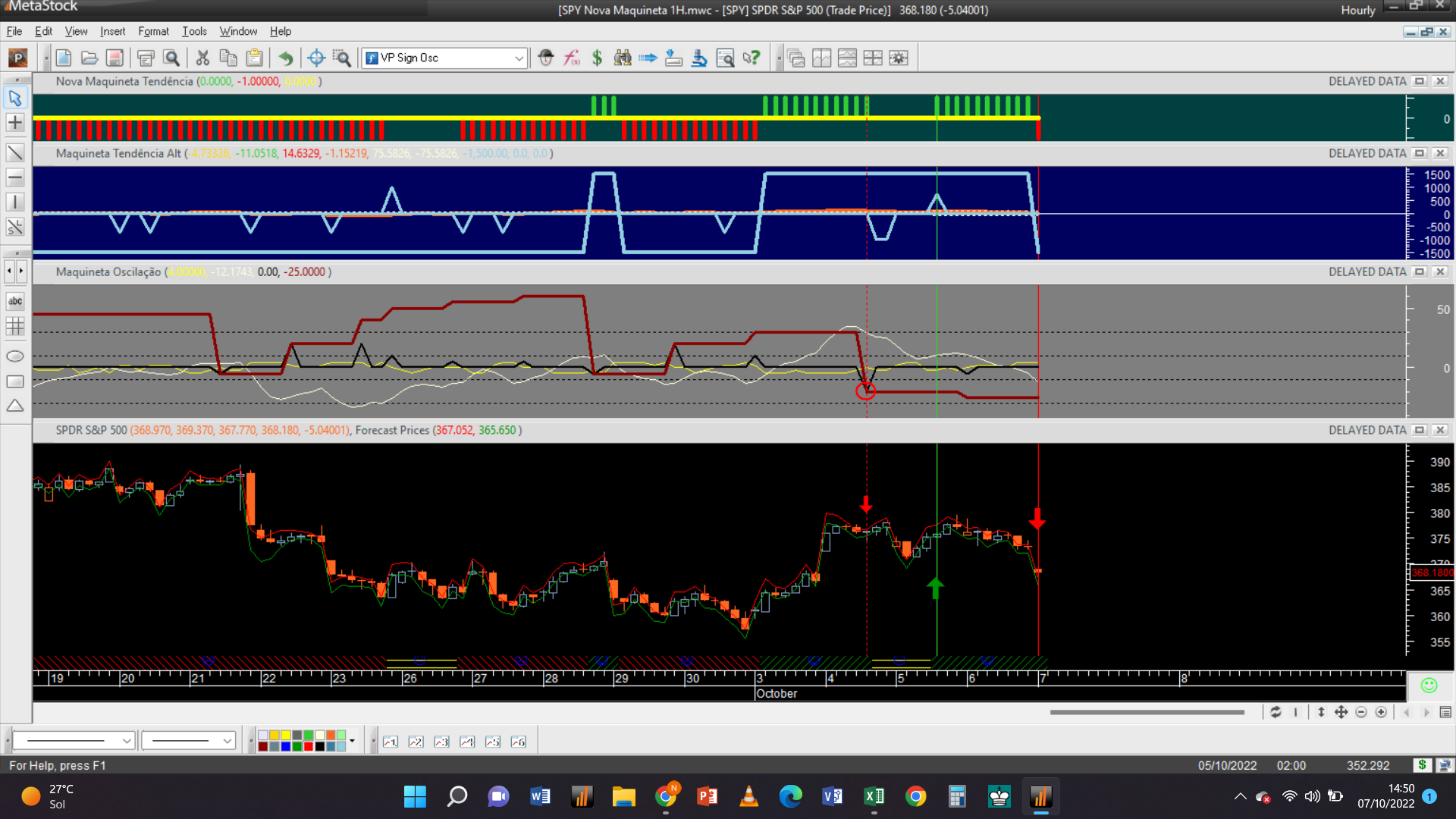 Antes de fornecer aqui a próxima trade permitam-me efetuar um aviso: troquei o gráfico dos 2 dias pelo de 15 minutos, que à semelhança da escala de meia hora só possui autorização para trades do tipo oscilatório, porque detetei que o gráfico 2D padece dum problema dum “bug” curioso de origem, que acabei de detetar e que terei de relatar ao suporte de clientes da plataforma do Metastock.