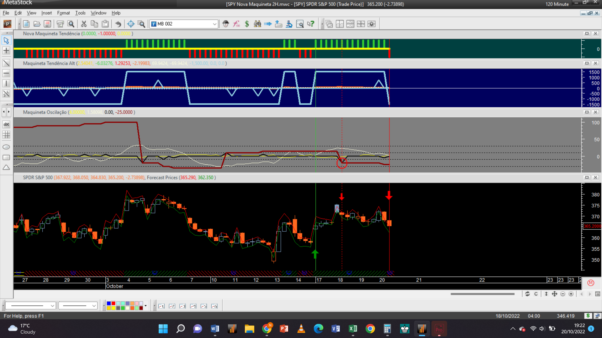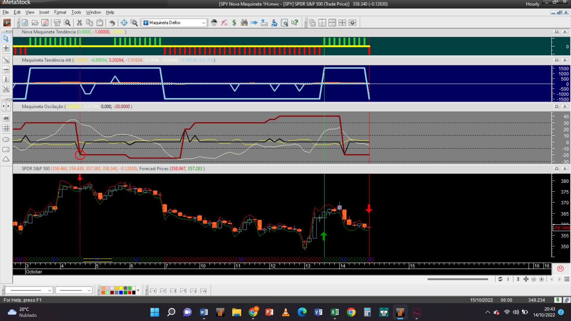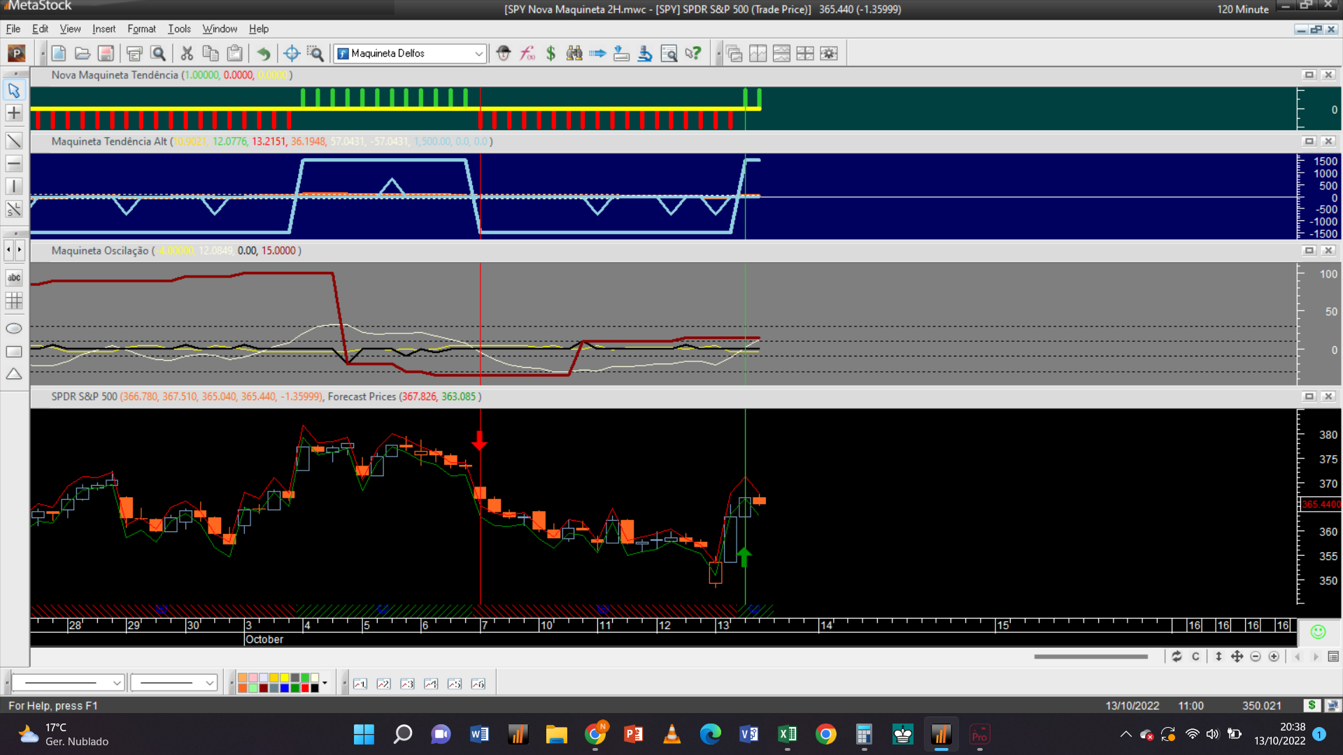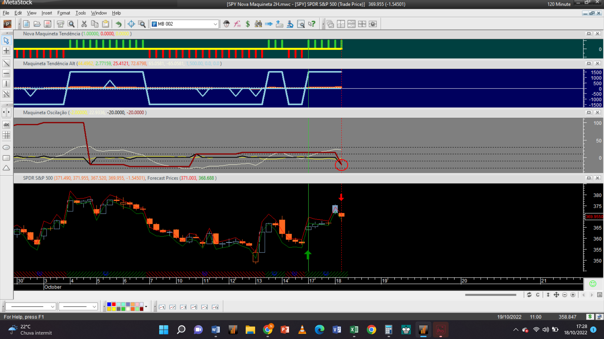 Antes de fornecer aqui a próxima trade permitam-me efetuar um aviso: troquei o gráfico dos 2 dias pelo de 15 minutos, que à semelhança da escala de meia hora só possui autorização para trades do tipo oscilatório, porque detetei que o gráfico 2D padece dum problema dum “bug” curioso de origem, que acabei de detetar e que terei de relatar ao suporte de clientes da plataforma do Metastock.