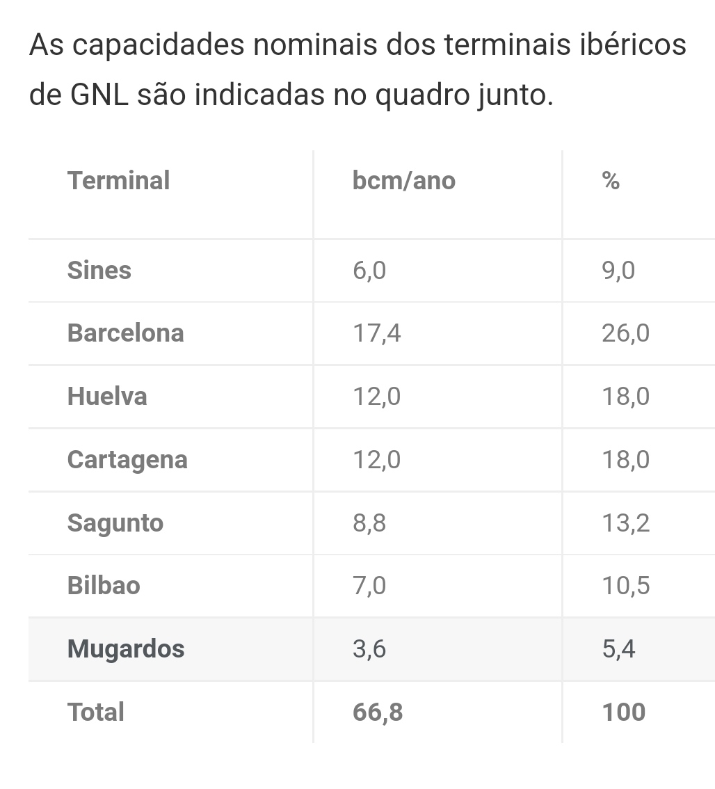 A capacidade de armazenamento de Espanha em GNL é 10 vezes a de Portugal. Barcelona tem 3 vezes mais capacidade do que Sines. Mesmo que Sines duplique a sua capacidade de importação para 12 bcm e se Barcelona fizer o mesmo para 35 bcm vejam bem o handicap.