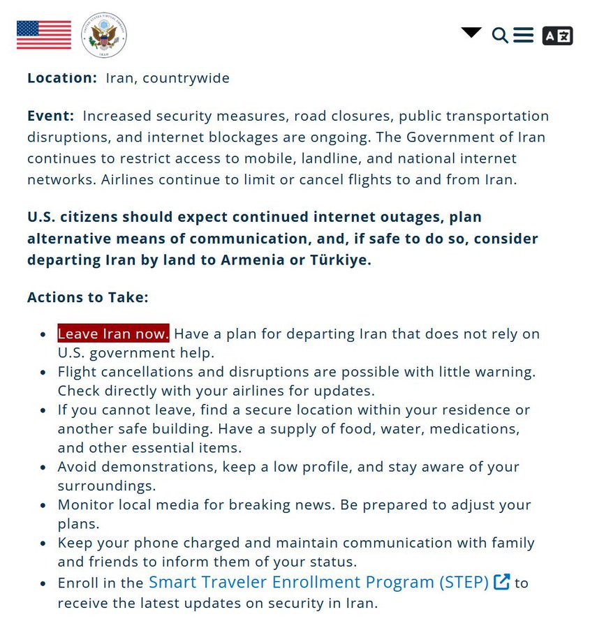 US state department issued warning to all US citizens to leave Iran immediately.