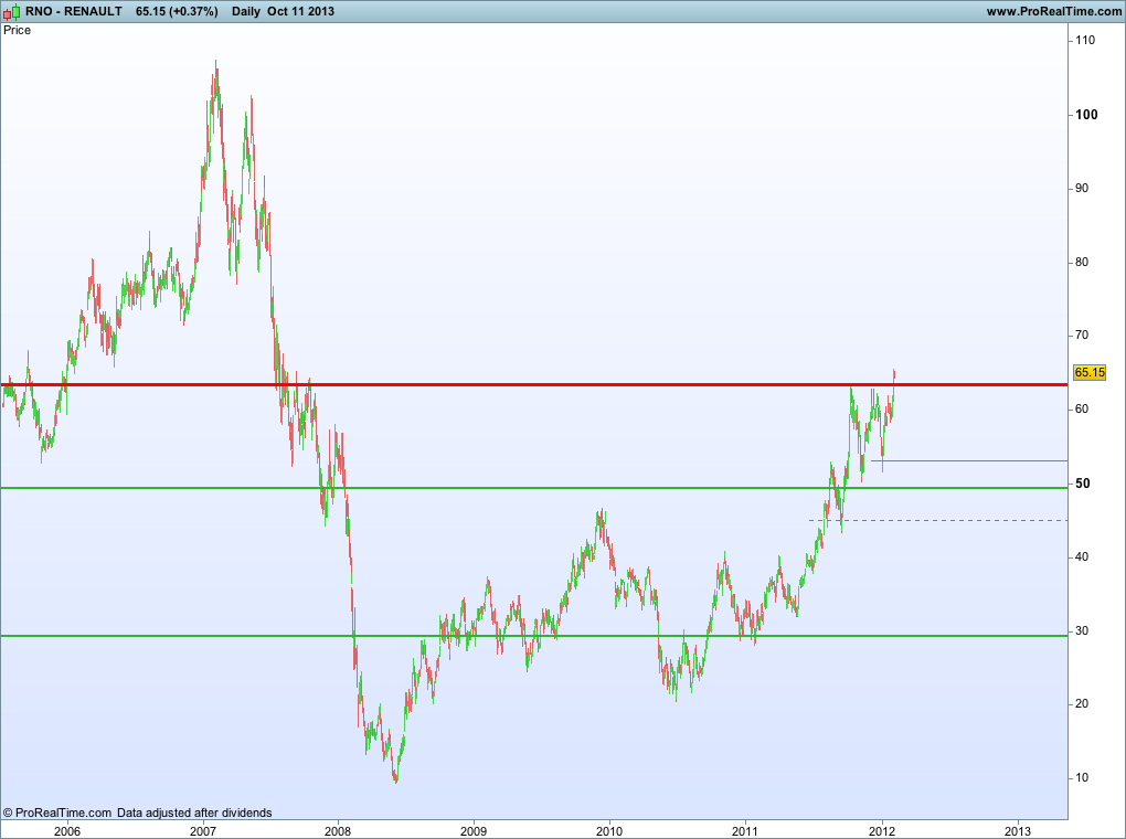 Se colocar-mos os gráficos do CAC40 e da Renaut lado a lado, podemos constatar que o seu desenho é muito muito parecido. Pelo menos nos últimos anos a Renault tem seguido bastante a tendência do CAC.