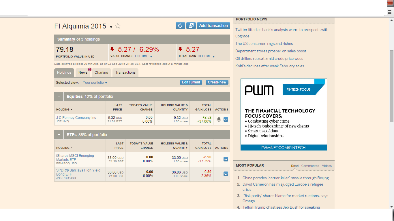 - o FI Alquimia 2015 - Face B tem posições abertas na jcp, no eew e no jnk (dois etf e uma acção; objectivo: compará-lo com um benchmark)"