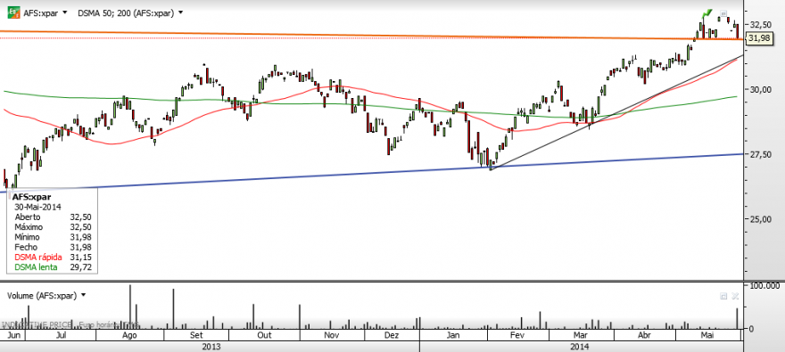 Quando se analisa uma ação em zona de máximos é dificil encontrar um valor para o "Target", utilizei uma figura que me parece viável, apenas isso...
