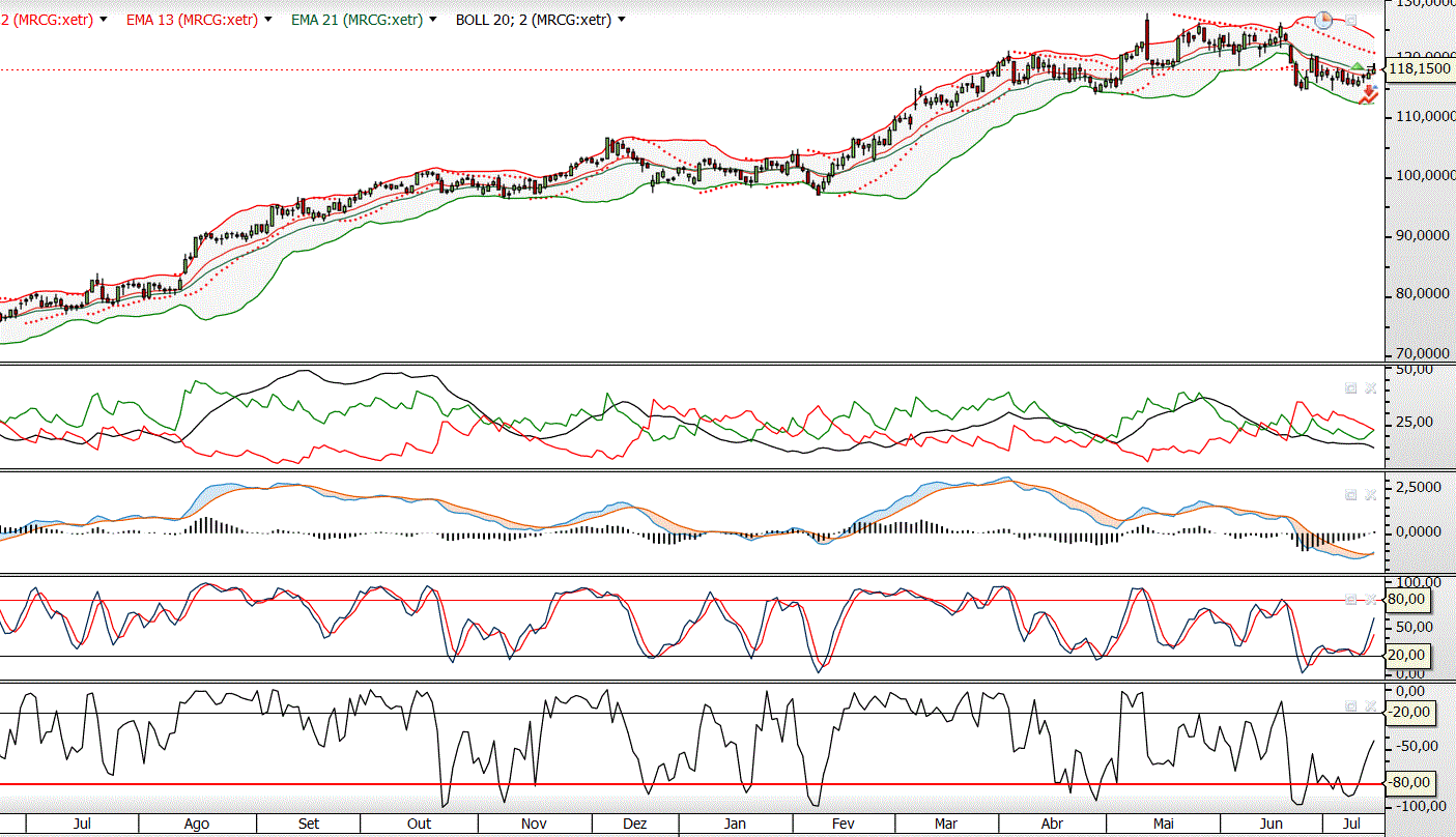 A entrada no título (CFD) ocorreu hoje (15.7.) a 118.70 e o stop loss foi colocado ligeiramente abaixo do último suporte, designadamente a 113,50.