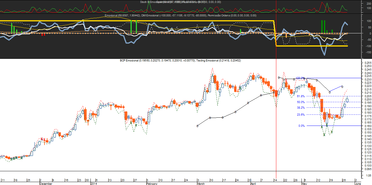 “…Embora não seja um analista, sou um mero trader com alguns anos de experiência, arriscar-me-ia a acrescentar que a potencial recuperação do BCP no curto prazo, caso os mercados retomem brevemente algum do terreno perdido nesta semana marcante, deverá ter como teto resistente a zona Fibo 50%/61,8% dos 0,1950 aos 0,2030 e aí eventualmente deverá ou poderá voltar a corrigir, ao perder a sua força elástica natural…”.
