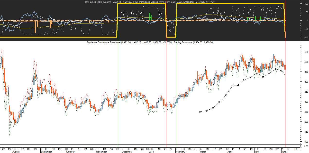 Apesar da recuperação ocorrida nestes últimos dias nos mercados em geral a carteira “Emocional 2014”, que já dispunha de um número muito reduzido de títulos comprados, acaba hoje de dar ordem para reduzir ainda mais a sua exposição ao risco ao surgir hoje uma ordem de venda na Soja, obrigando assim a fechar amanhã 1 trade tendencial e 2 trades oscilatórias que ainda se mantinham abertas até agora nesta commodity.