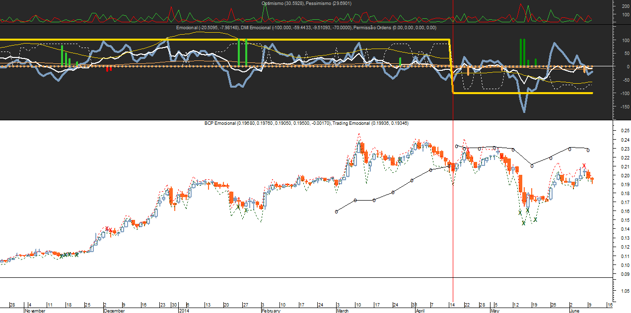 Esta conclusão resulta de um aumento generalizado da volatilidade no mercado, embora ainda pouco percetível, altura que normalmente os sistemas de trading deste tipo costumam acertar o passo com os ganhos da carteira. Para isso necessitam, no caso concreto deste sistema “Emocional 2014”, de cerca de 2 a 3 semanas para acertar agulhas e definir corretamente o sentido predominante do mercado, se este for em geral contrário à posição maioritária assumida, neste caso uma tendência maioritariamente virada para baixo.