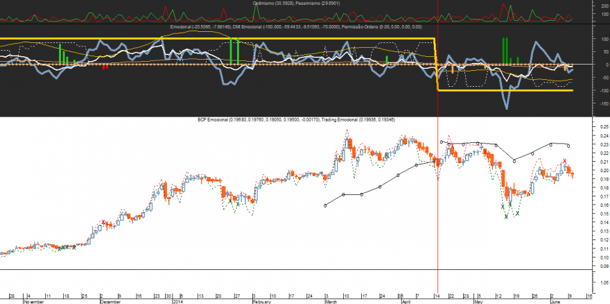 Um pormenor curioso do fecho de hoje no BCP residiu no facto do programa ter ajustado o rating emocional de curto prazo em queda, como se pode detetar através da linha azul clara em bold no gráfico dos indicadores, virada para baixo.