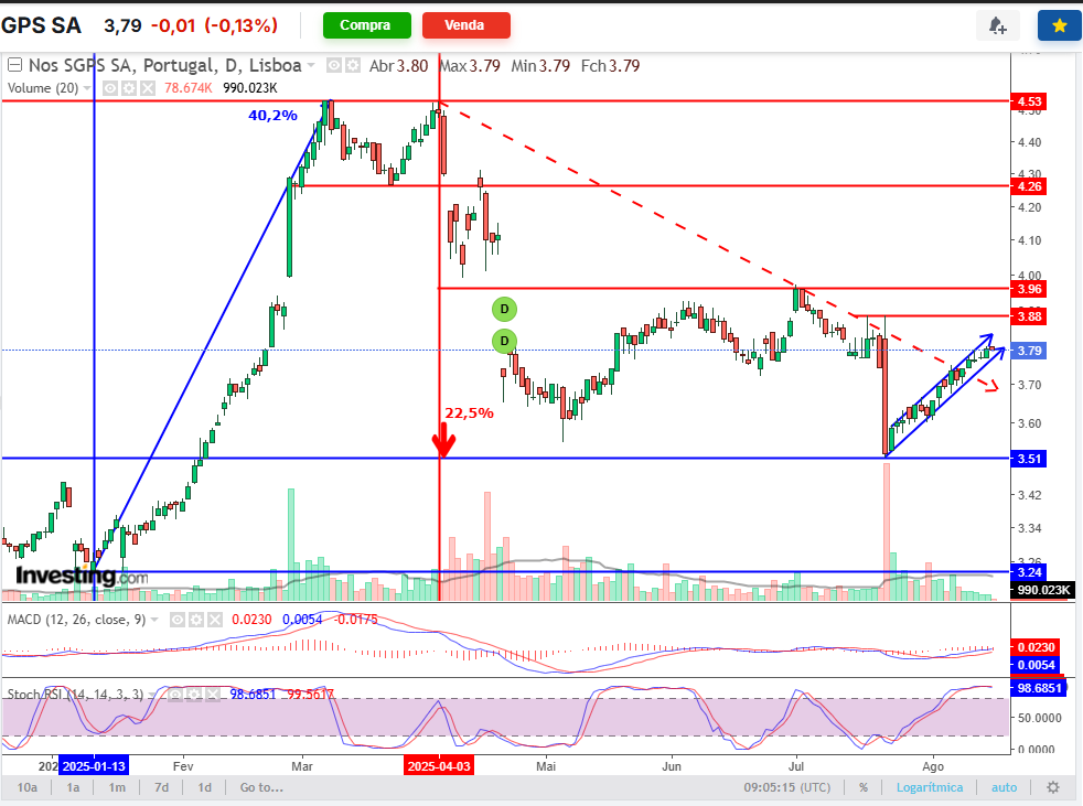 a NOS acabou de formar a golden cross tal como ocorreu em meados de fevereiro de 2025, onde iniciou o movimento de subida até ao máximo conhecido deste ano antes de pagar dividendos nos €4,53.